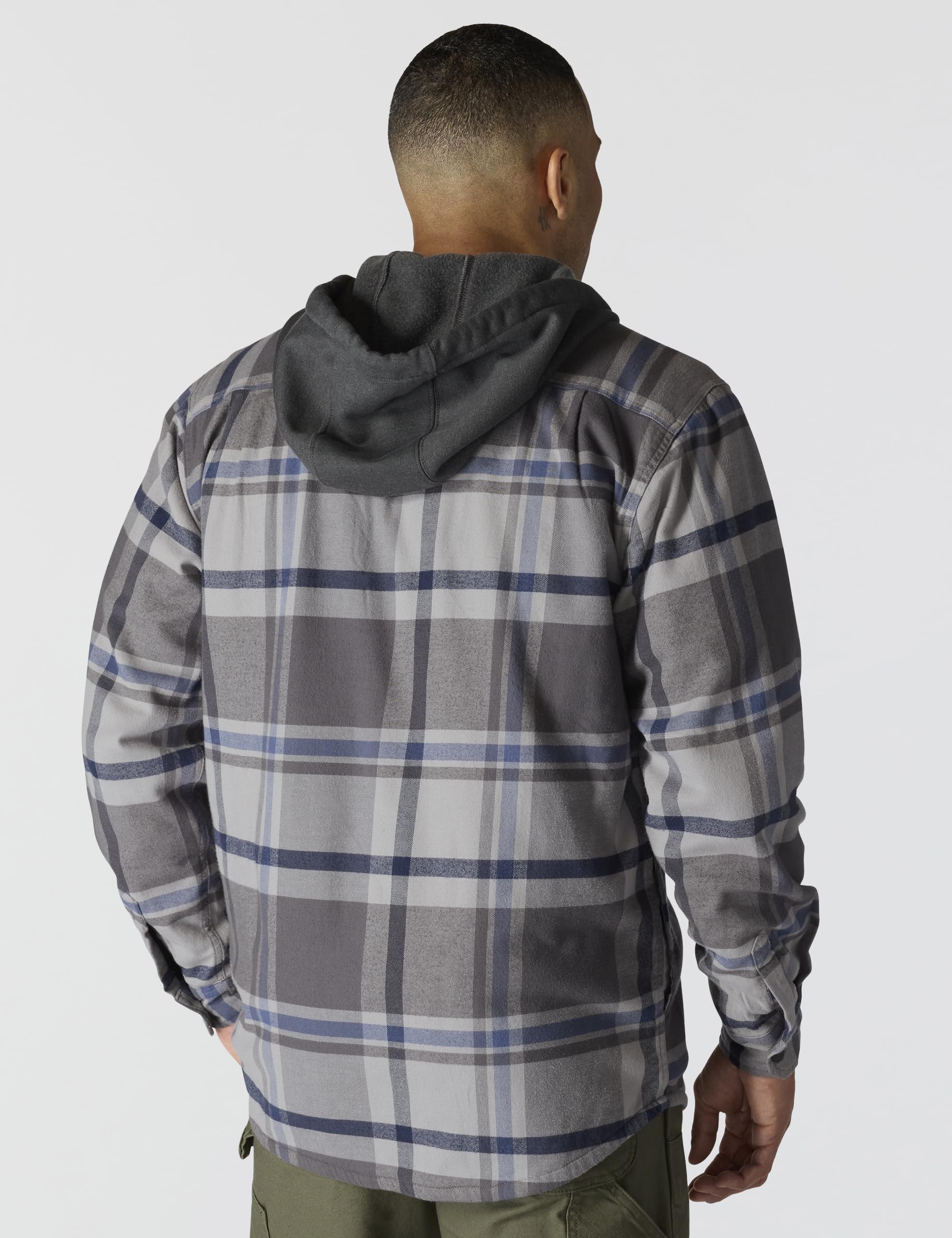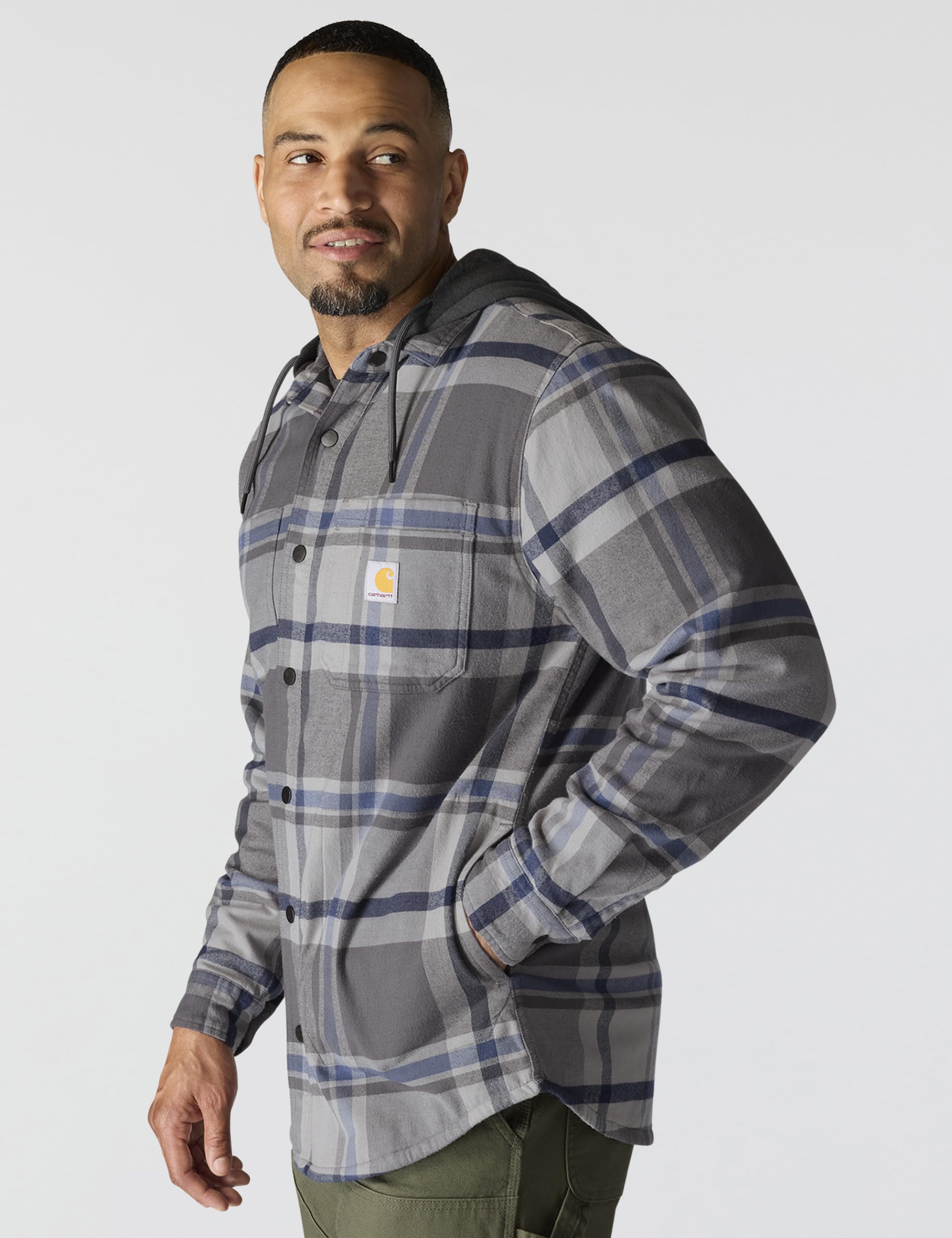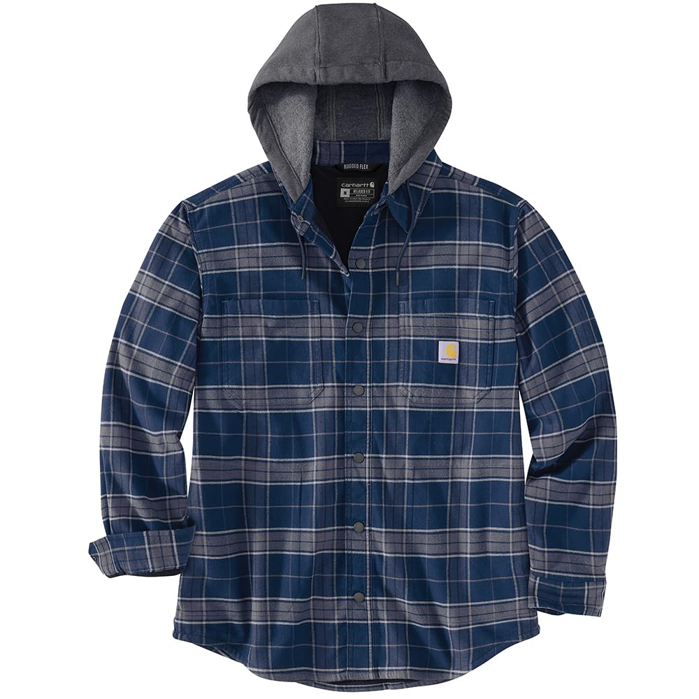 Description Made for work that requires a full range of motion, this men's Carhartt hooded flannel shirt jac is a versatile layer for cold shops and outdoor work. It's fleece-lined for warmth with built-in flex for an unrestricted range of motion. A relaxed fit offers a little extra room to bend and move.
