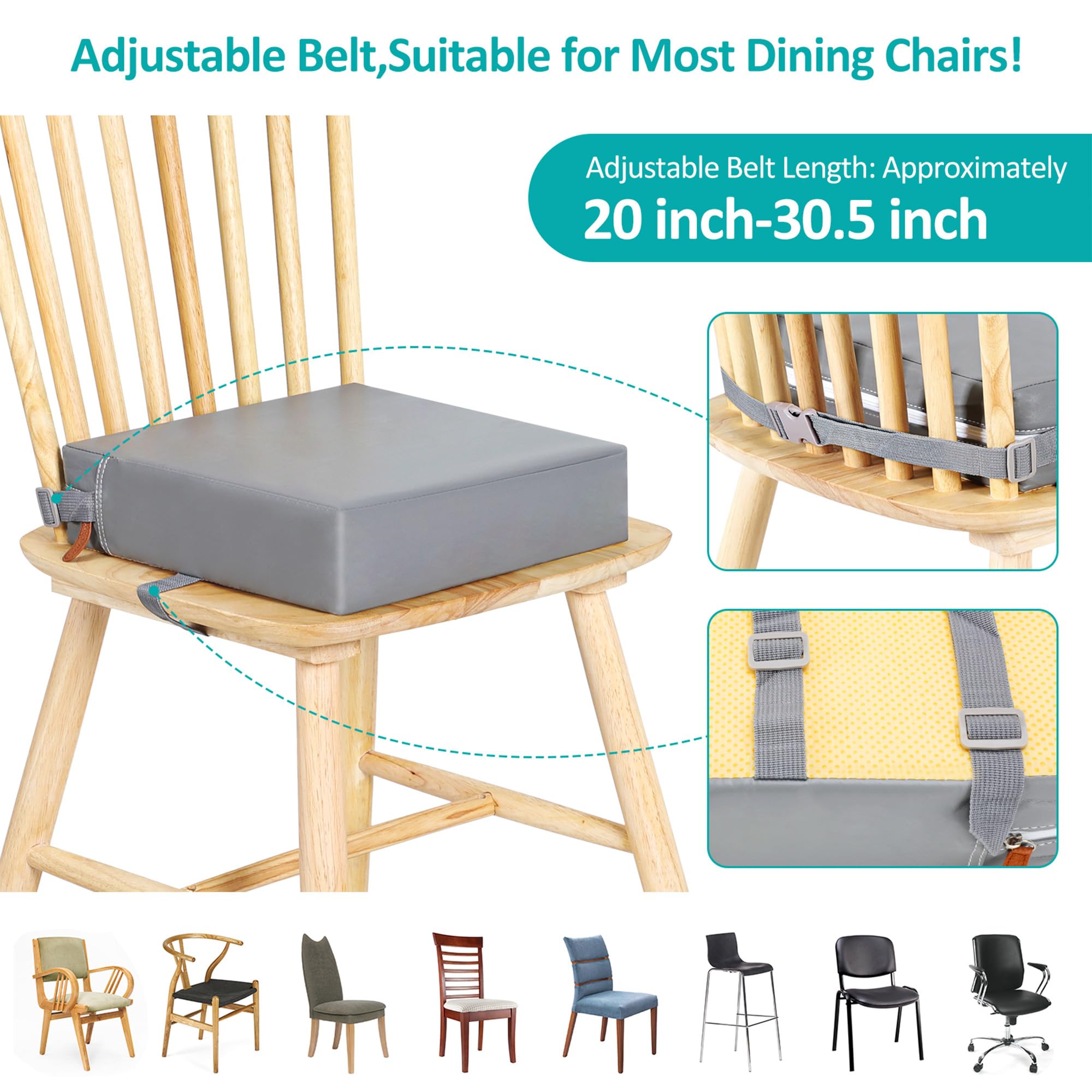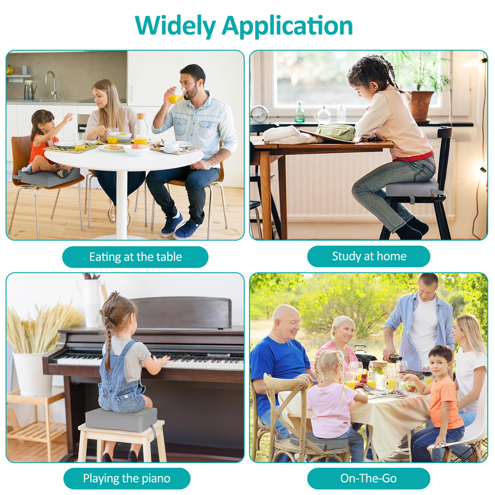 SAFE & NON-SLIP - The booster seat dining has two adjustable seat belts,which can firmly fix the booster seat cushion to the chair from the bottom and back,the bottom of booster is made of non-slip silicone,so that booster seat dining is not easy to slide,ensure the safety of kids when eating on the table.The extend length of two adjustable seat belts is 20 inch-30.5 inch,so it is suitable for most dining chairs