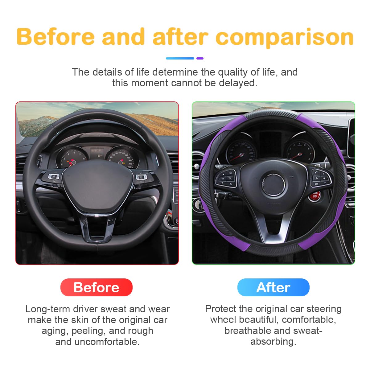 【Carbon Fiber Leather】: High-quality carbon fiber leather material, with wear-resistant, anti-slip properties, more durable in daily use, give you a stronger grip when driving, no longer worry about hand slip, ensure driving safety. The soft leather material not only protects your steering wheel, but also provides you with an excellent touch and reduces driving fatigue.