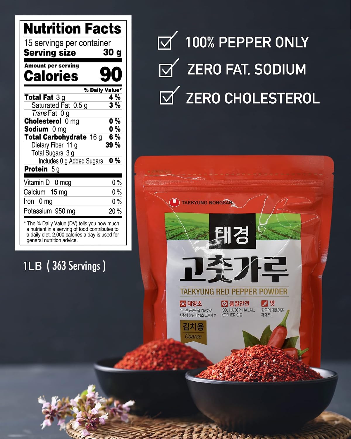 PROCESSED IN SOUTH KOREA - Proprietary grounding process is carried out at Taekyung’s GMP/ISO certified factory in South Korea. Peppers are cultivated on Taekyung’s farm in China with Korean pepper seeds in order to keep the price affordable for premium sun dried process. This involves greater labor cost compared with cheap machine dried process.