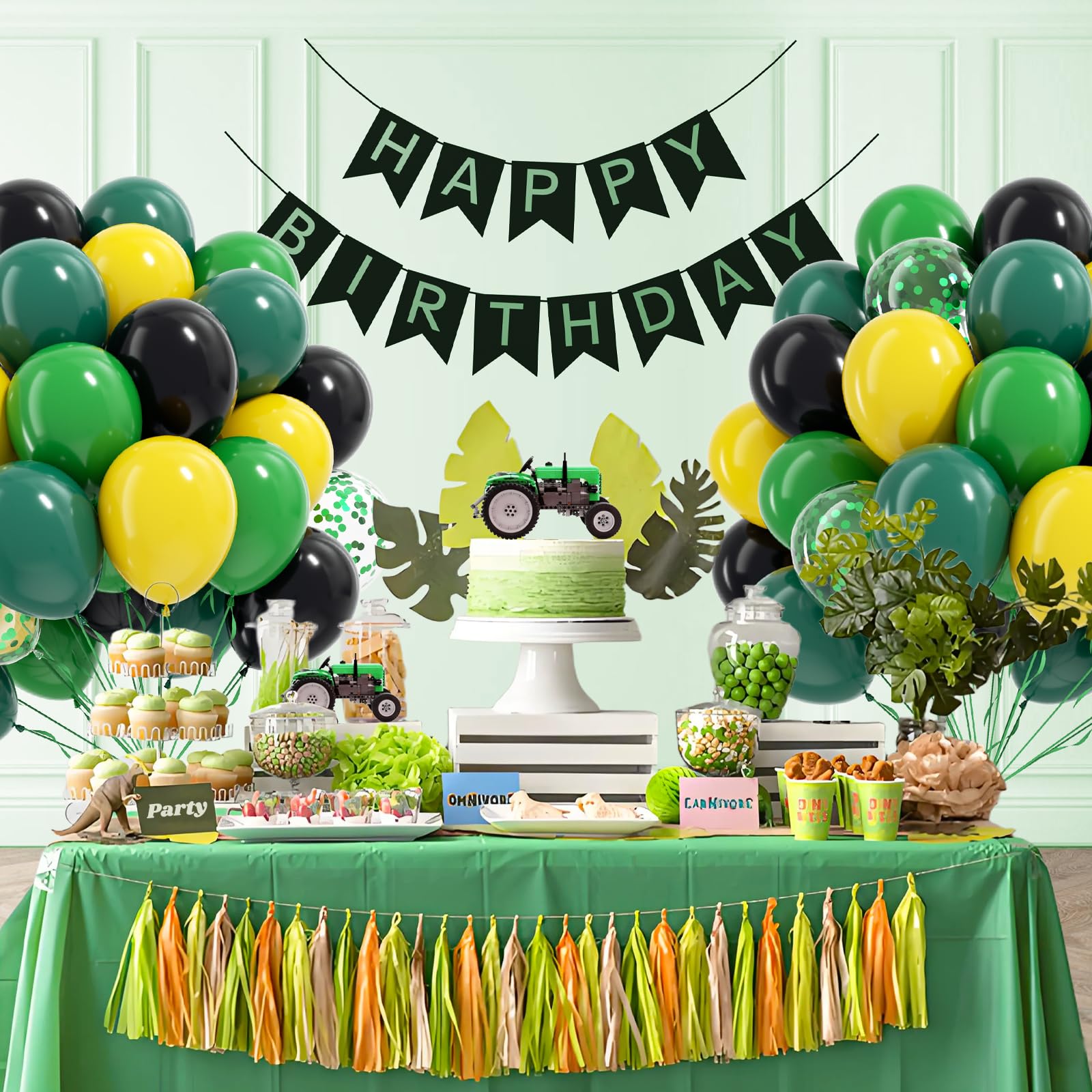 Package Include: The tractor balloons included 12inch dusty green balloonsx15, 12inch dark green balloonsx10, 12inch black balloonsx15, 12inch yellow balloonsx10, 12inch green confetti balloonsx10, glue dotsx20, green ribbonx1