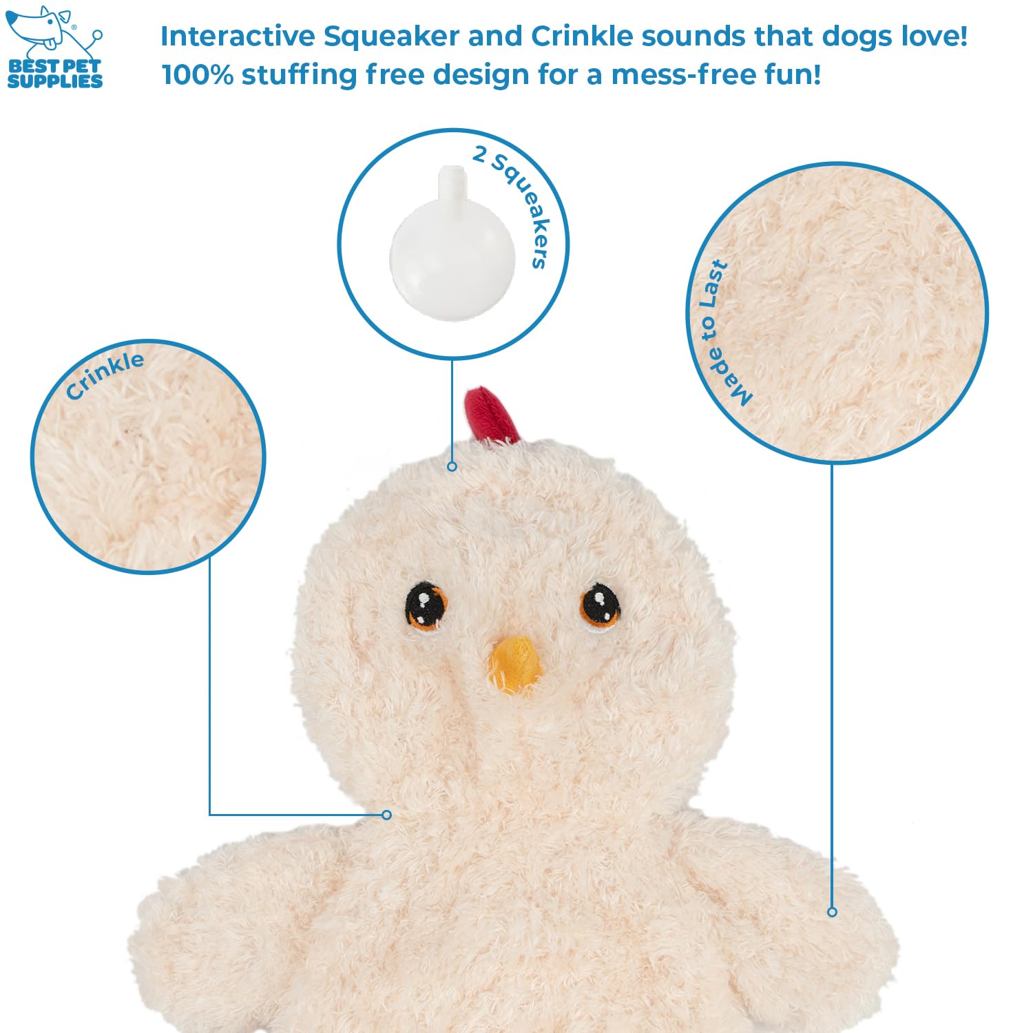 Squeaks and Crinkles – These dog chew toys feature crinkle material in the legs and stuffing in the head that squeaks to give them multiple stimulation points for a more interactive play. And they come in exciting colors, too!