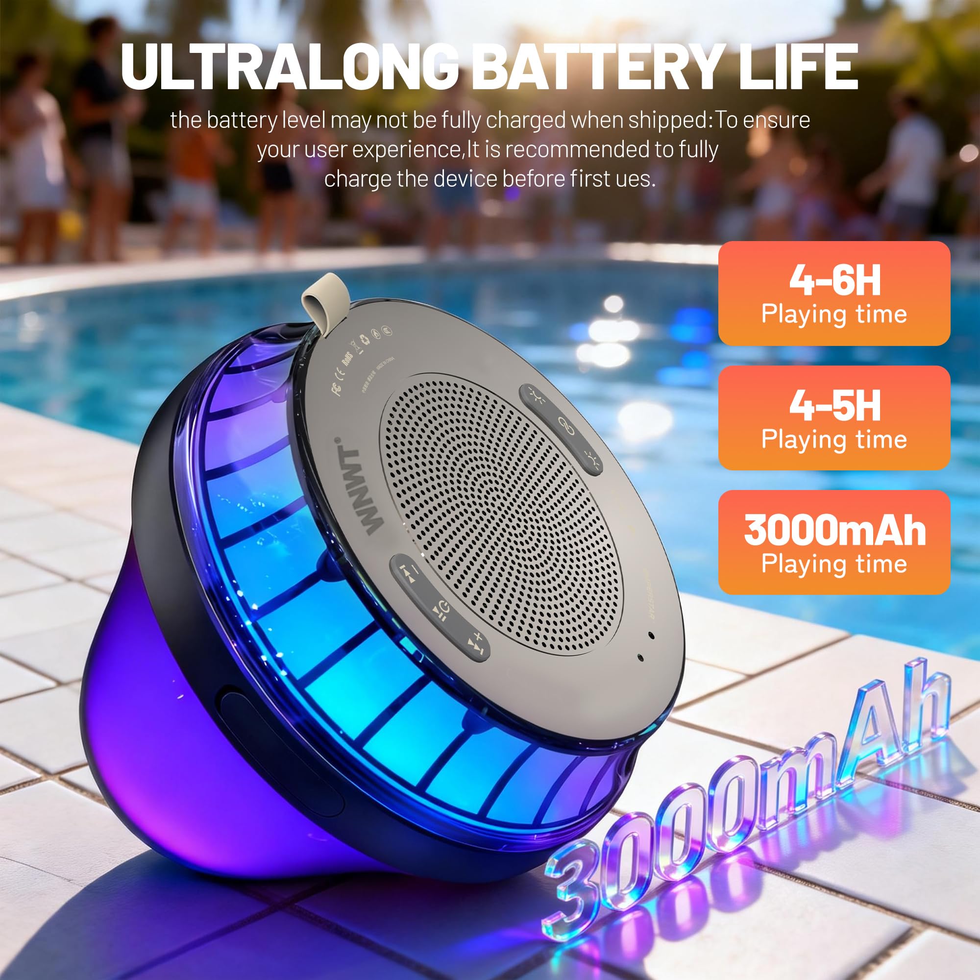 [Masterpiece of Great Designer] – The design story of our floating pool speaker derived from our aquatic pleasures and love for music. Inspired by pool parties in summer sunlight, our team intended to design a pool speaker that providing vigor and pleasures for each moment. The streamlined style and brilliant colors make it differ from other products with dazzling light made of cheap plastics. The professional pool floating speaker is not a toy at all. The practical hot tub speaker can be the focus of any pool at night