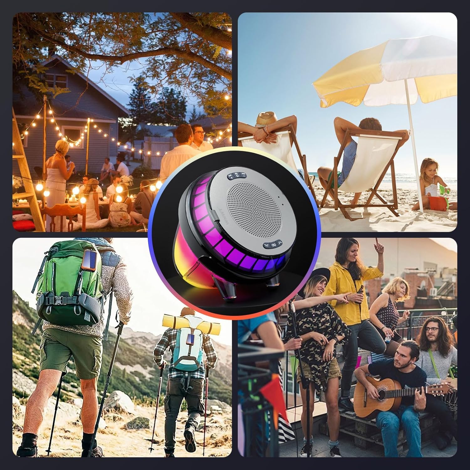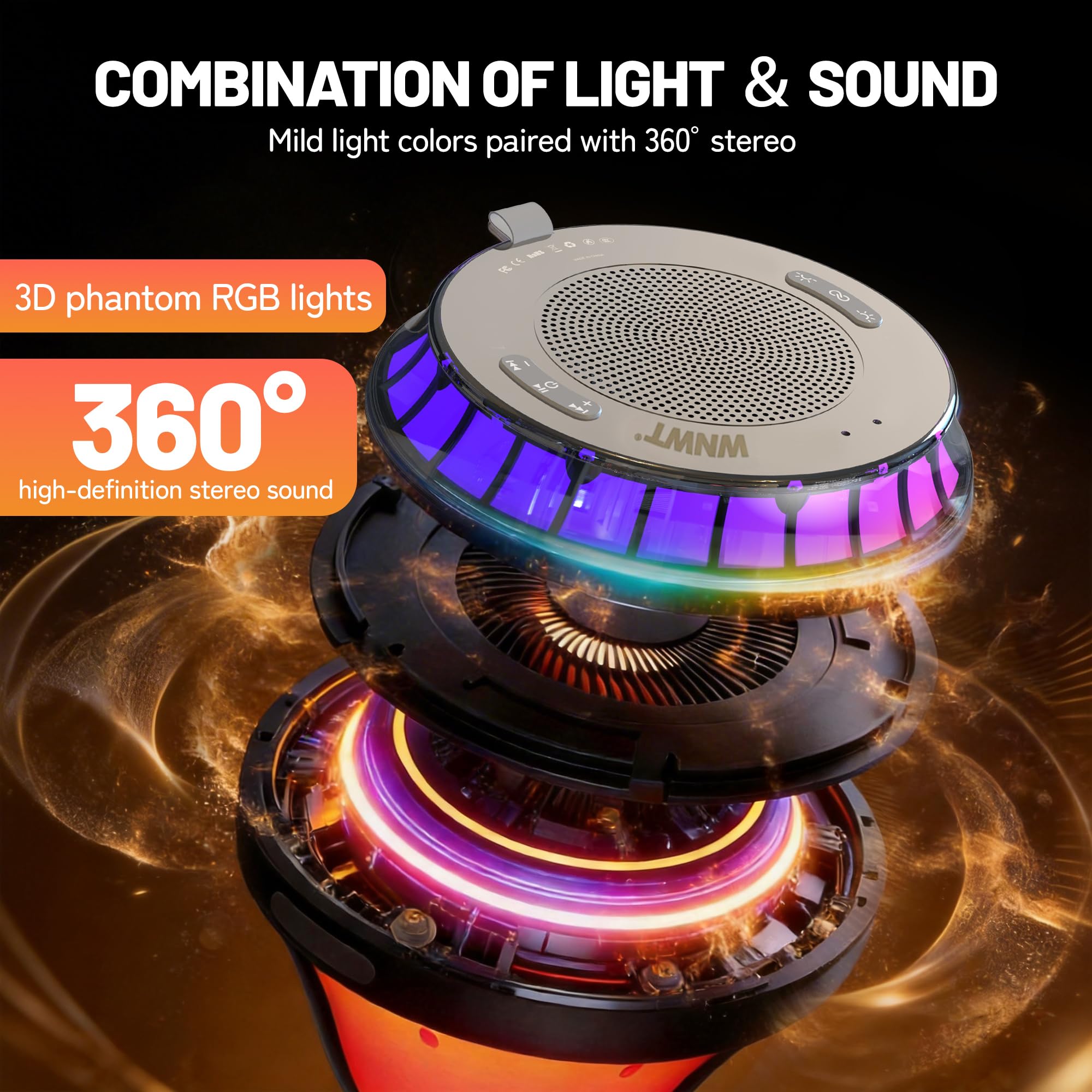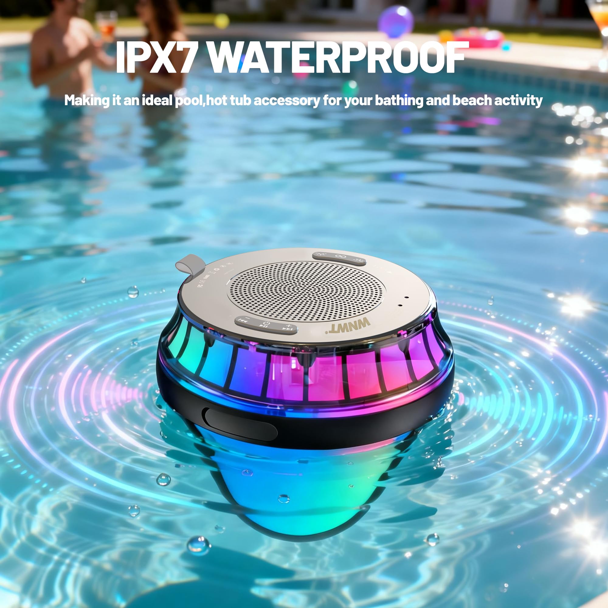 [Combination of Light & Sound] – The floating speaker for pool provides five vigorous lighting models to create atmospheres! Dynamic and static lighting provides mild, enchanting atmospheres; mild light colors and changes help you relax, and the flickering lights changing with music beats can enhance your overall experience. With 360° stereo, the hot tub lights makes each note clear, appealing, full of sense of depth