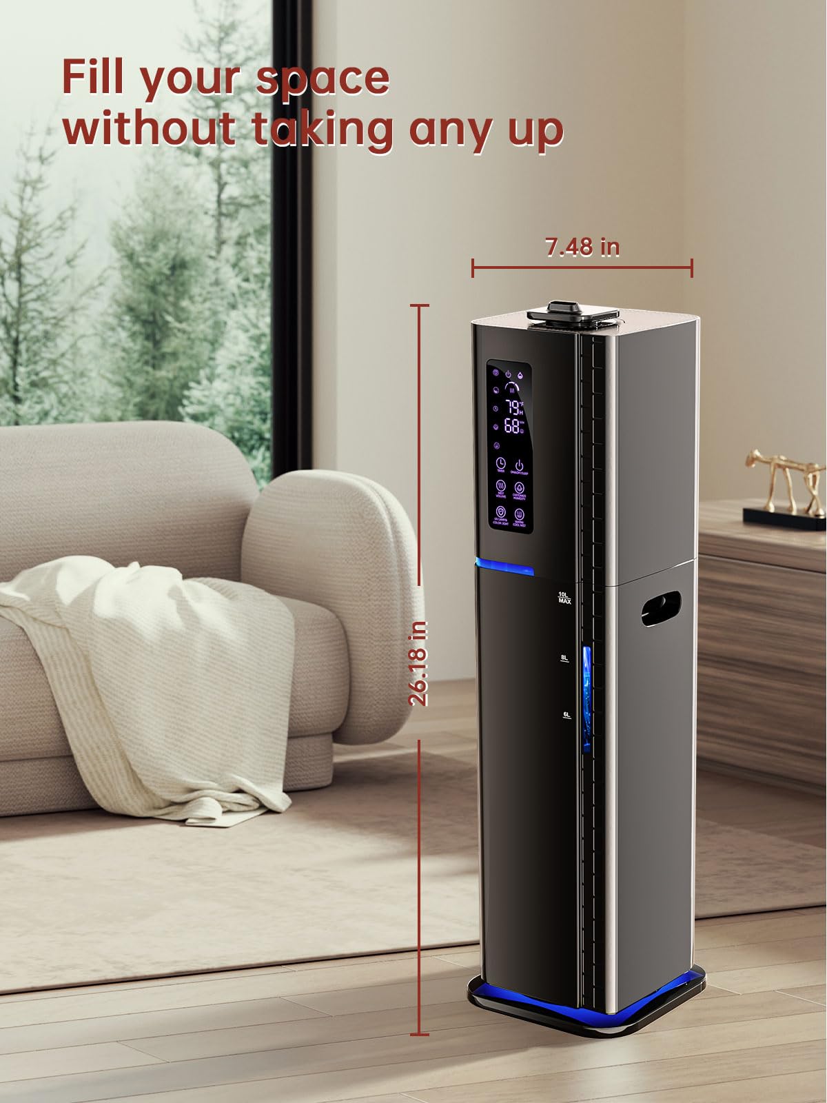 【Ultimate Humidifying Solution】The JS2325 bedroom humidifier ensures rapid humidification with a warm mist that reaches 120°F in just 5 minutes, providing immediate relief from dryness. It features a large 2.64Gal water tank, capable of producing a powerful mist output of 500ml/h for rooms up to 500ft², allowing for up to 60 hours of continuous use on low mode. With a 7.48 x 7.48 x 26.18 inches sleek, compact design, it blends effortlessly into any room without taking up too much space.