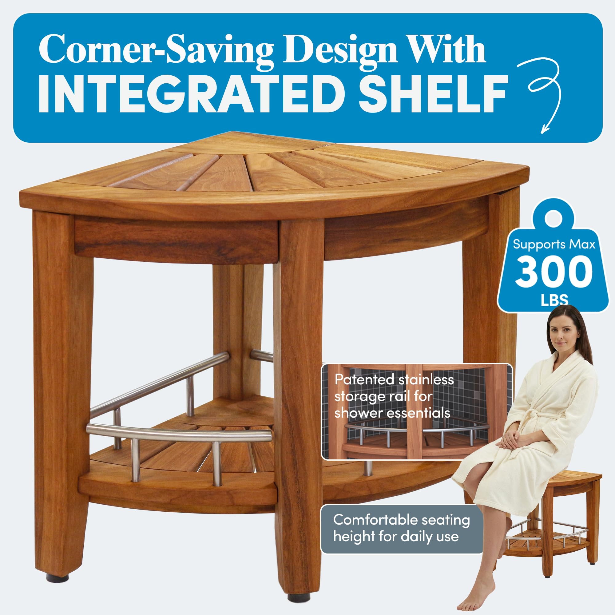 Smart Storage Design: Built with all stainless steel, non-corroding screws, this teak wood bench is built to last. Designed with a built-in corner shelf, it helps you organize your bathroom essentials. Keep your soaps, towels, or razors easily accessible while maintaining a clutter-free space. Ideal as a shower organizer or bathroom shelf, this bench maximizes both functionality and style.