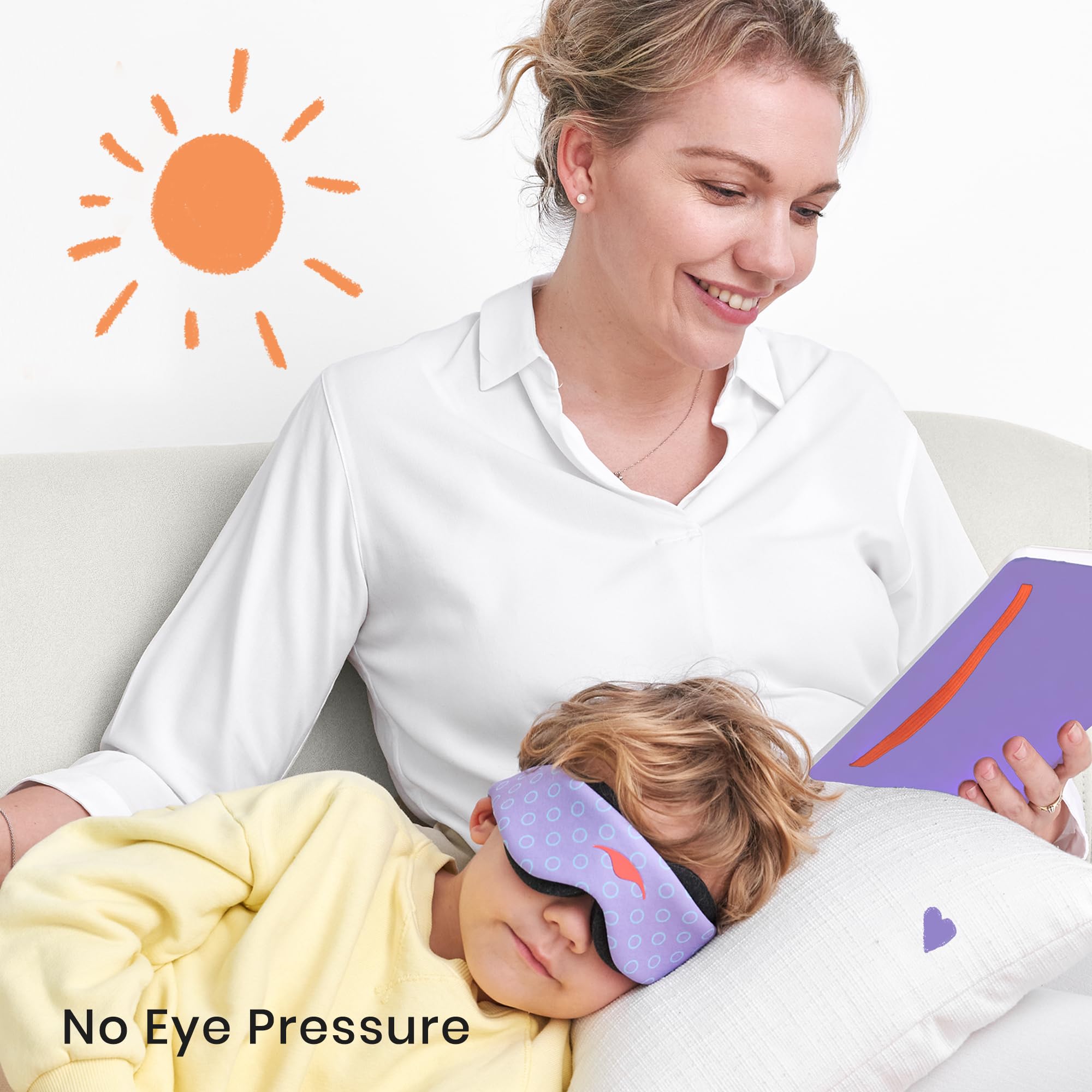 Absolutely No Eye Pressure — Adjustable, extra-deep eye cups put zero pressure on the eyes. Kids can blink like they’re not wearing a sleeping mask.