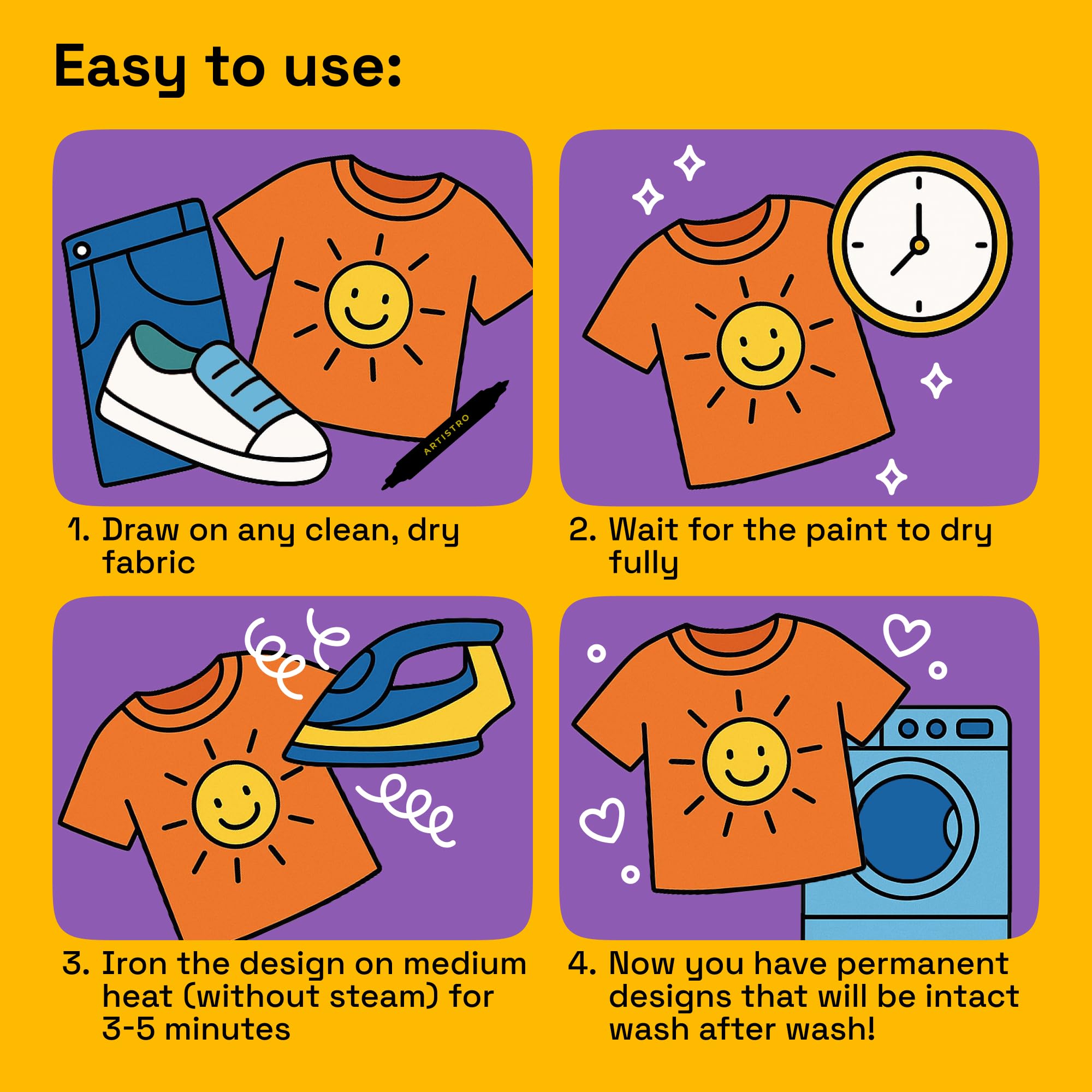 Easy-to-Use: These fabric pens for clothes permanent are easy to use and are even perfect as fabric markers for kids! Simply apply your design to clean, dry fabric. After the clothes paint is fully dry, set the design by ironing it on medium heat (without steam) for 3-5 minutes to ensure long-lasting results.