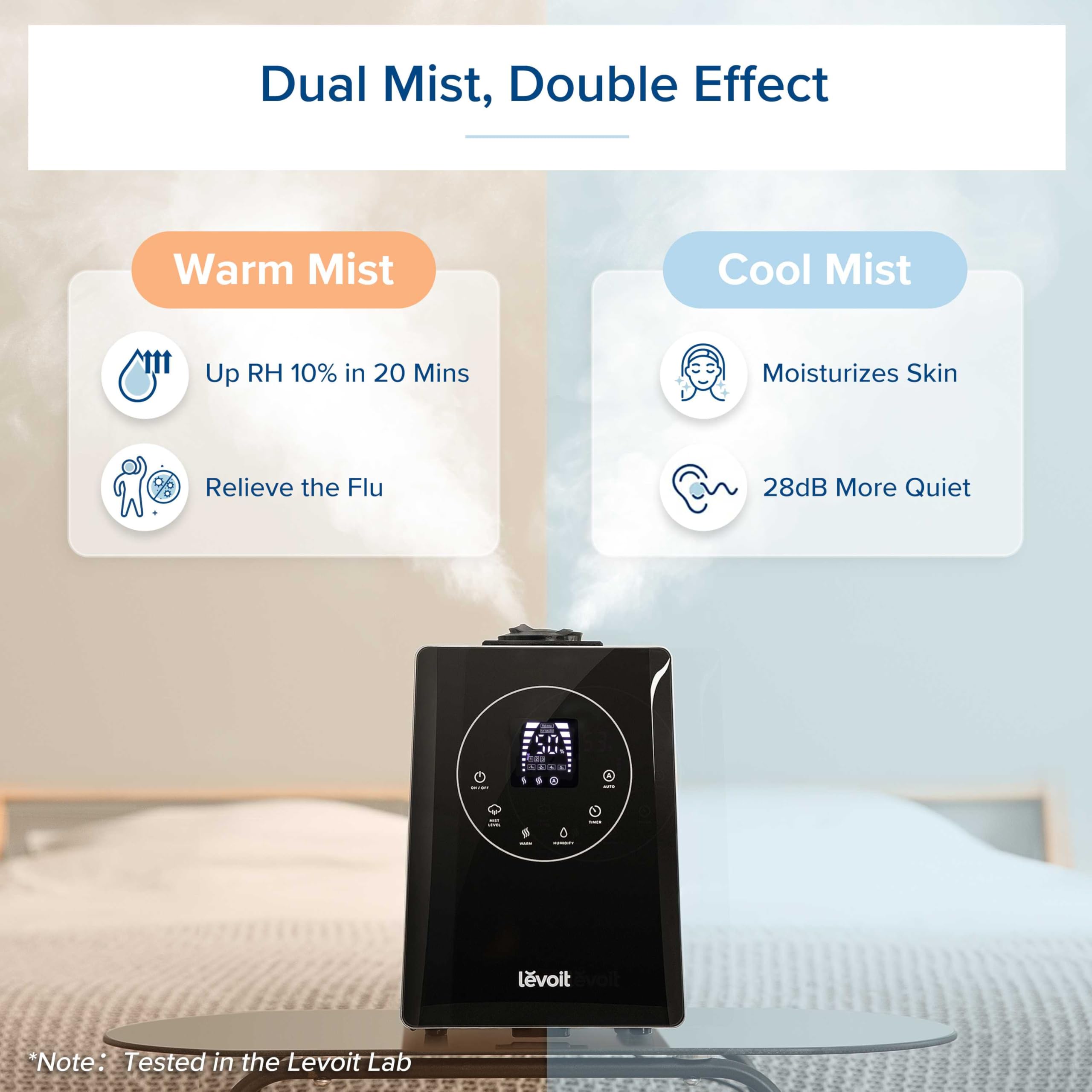 Warm and cool mist ultrasonic humidifier disperse warm and cool mist throughout your living spaces to create a soothing atmosphere at home with the LEVOIT Hybrid Ultrasonic Humidifier. Got a cold or the flu? The warm, soothing mist helps you relieve from cold,flu,and mineral dust around your living spaces. If you have trouble sleeping at night, the cool mist will alleviate congestion or a cough by keeping your throat and nasal passages hydrated. Moisturize your skin and reduce static electricity in your home with the cool mist function. Technical Specifications: Voltage: AC 120V / 60Hz Rated Power: 280W Water Tank Capacity: 6L (1. 59 gals) Max Cool Moisture Capacity: 300ml/h Max Warm Moisture Capacity: 500ml/h Running Time: 10-60 hours Package Included: 1 x Hybrid Ultrasonic Humidifier 1 x Remote Control 1 x Cleaning Brush 3 x Aroma Pads (1 pre-installed) 3 x Absorption Pads (1 pre-installed) 1 x User Manual Note: Use distilled water or filtered water instead of tap water, use tap water might leave white dust and grow mold. DO NOT put the humidifier on the wooden floor or wooden furniture directly unless a towel is placed on the wooden surface. Use caution when setting the warm mist function, the mist being diffused is hot. Clean once a week to prevent buildups and extend product lifetime. The minimum amount of water needed for the humidifier to function is 2cups (480ml). It is recommended to place the humidifier on elevated-level surfaces such as desktops, tables, or nightstands.