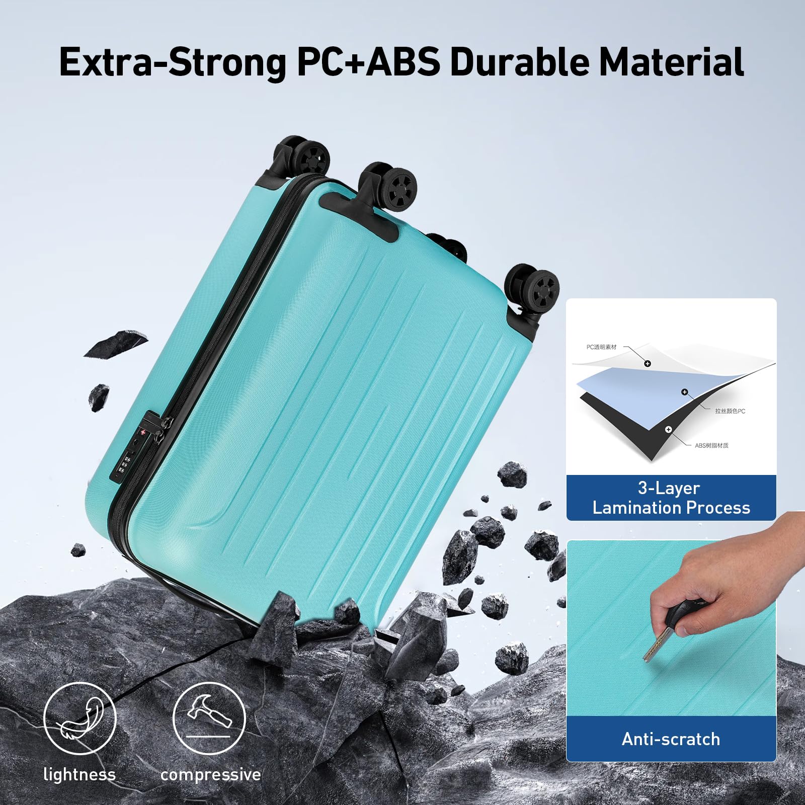 Lightweight Yet Unbreakable: Crafted from premium PC+ABS material, this suitcase is featherlight yet tough enough to withstand extreme temperatures (40-50℃) – because your adventures shouldn’t have limits!