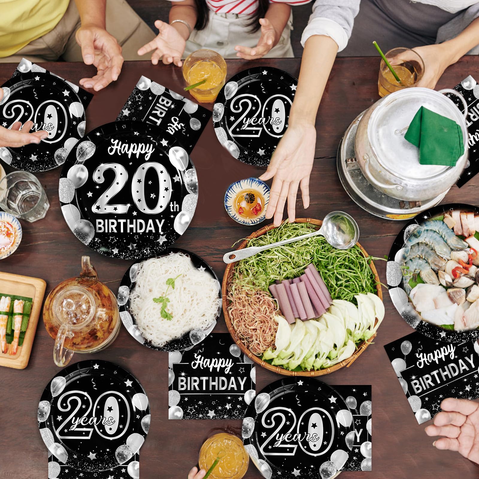 Grencian 96 Pcs 20th Birthday Supplies Plates Silver Black 20th Birthday Party Plates Disposable Sweet 20 Twenty Years Old Decorations Paper Tableware for Boys Girls Party Supplies Serves 24