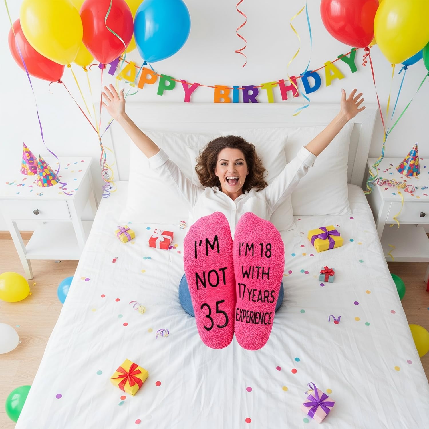 35TH BIRTHDAY GIFT IDEAS: Celebrate with our "I'M NOT 35, I'M 18 WITH 17 YEARS EXPERIENCE" socks, good for any occasion. They are ideal for Birthday presents, Christmas surprises, or playful White Elephant gifts.