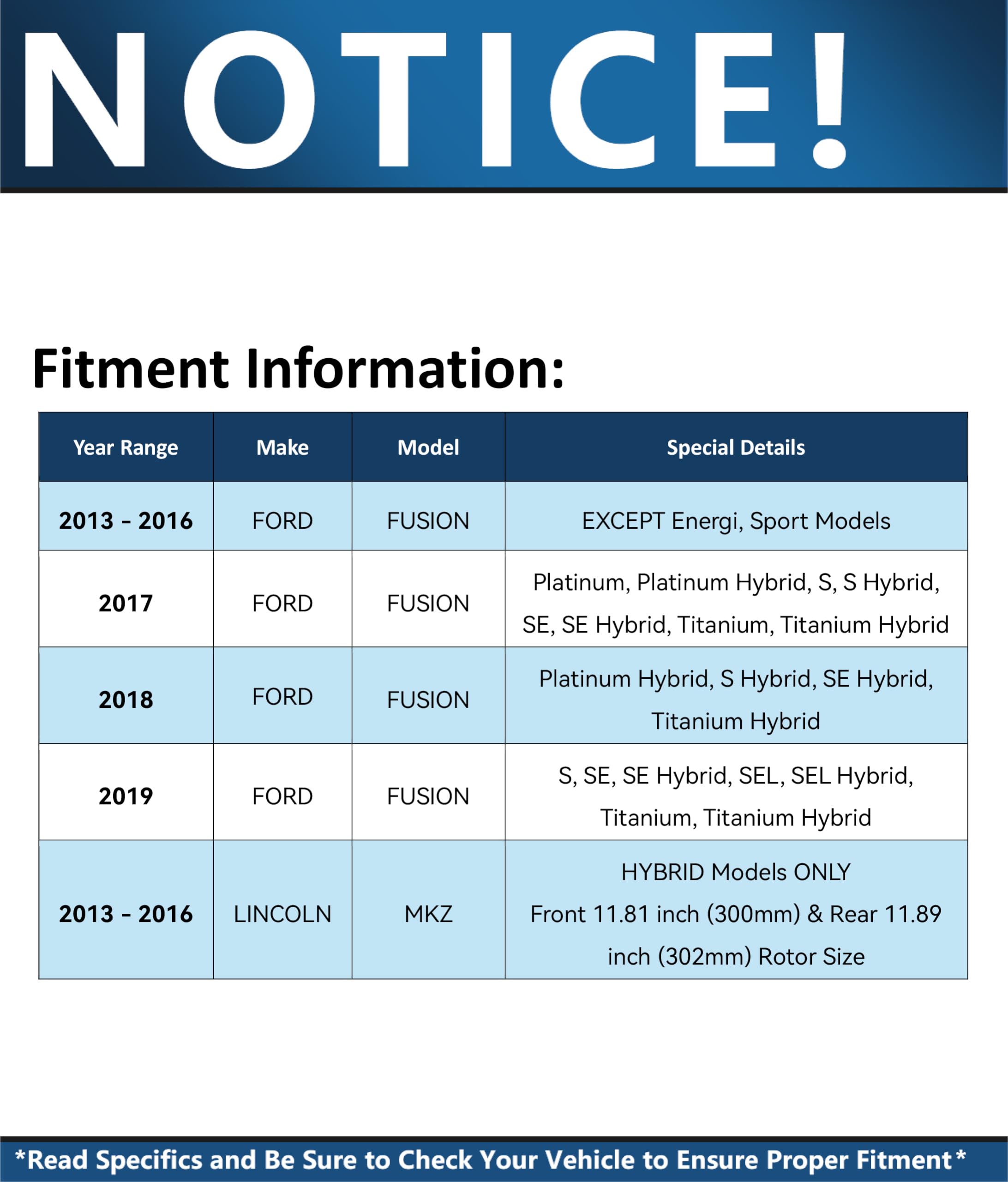 Brake Rotors Replacement for 2013-2016 Ford Fusion (Except Energi Titanium, SE Luxury, Energi SE) - [2017-2018 Ford Fusion (Platinum Hybrid, Platinum, S Hybrid, S, SE Hybrid, SE, Titanium Hybrid, Titanium)] - 2019 Ford Fusion (Except Sport, Energi Titanium, SE LUX Hybrid, Energi SEL) - [2020 Ford Fusion (Except Energi Titanium, Energi SEL)] - 2013-2016 Lincoln MKZ (Hybrid; FULL HYBRID EV-GAS (FHEV)) - [2015-2016 Lincoln MKZ (Black Label Hybrid; FULL HYBRID EV-GAS (FHEV))]