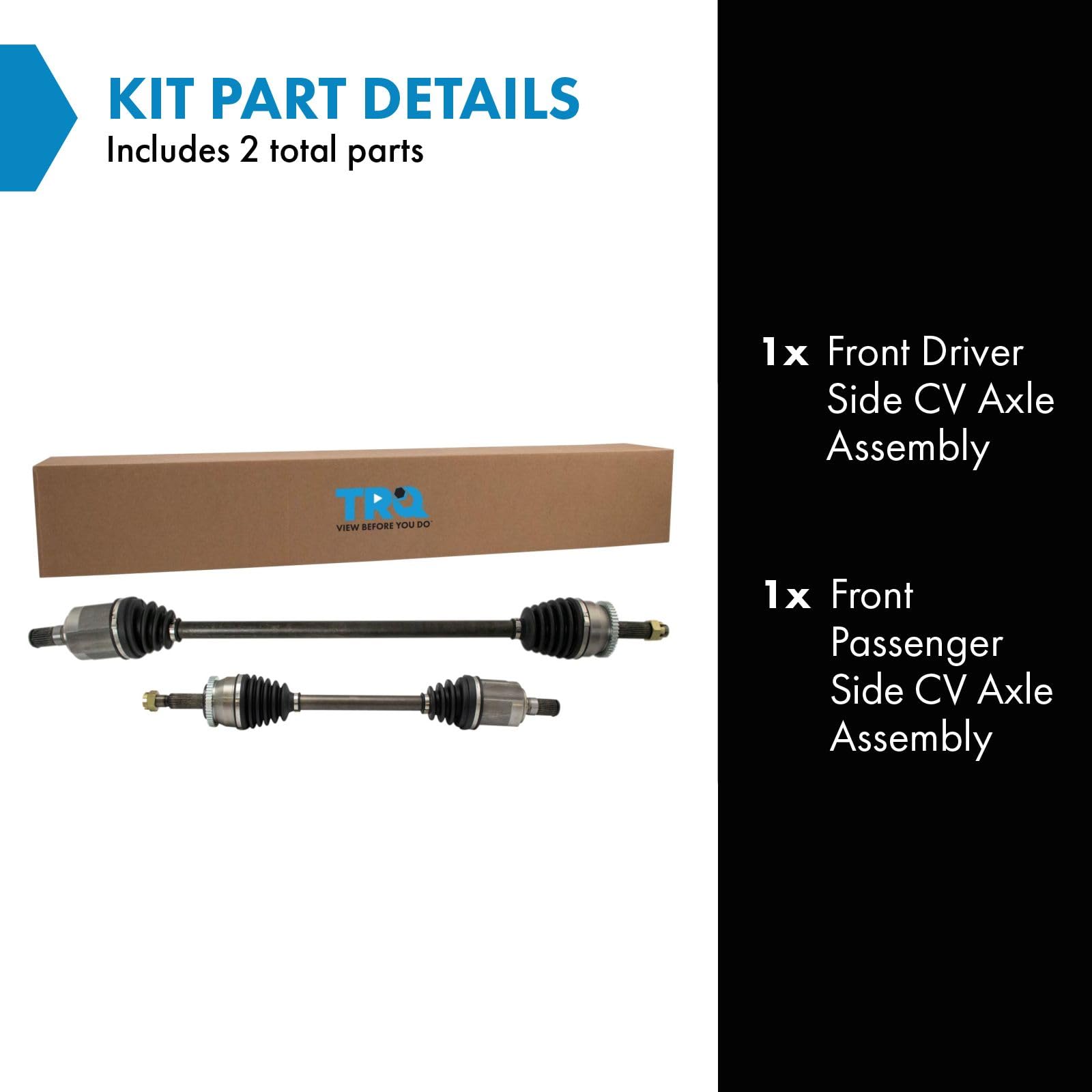 2 Piece CV Axle Assembly Set Kit Includes (1) Front Driver Side CV Axle Assembly (1) Front Passenger Side CV Axle Assembly Fitment Compatible with: 2013 Kia Optima EX L4 2.4L Front Driver & Passenger Side Compatible with: 2013 Kia Optima LX L4 2.4L Front Driver & Passenger Side Compatible with: 2011-12 Kia Optima LX L4 2.4L Automatic Transmission Front Driver & Passenger Side Compatible with: 2011-12 Kia Optima EX L4 2.4L Automatic Transmission Front Driver & Passenger Side Product Attributes Quantity: 2 Piece Product Features 100% New: Manufactured to tighter tolerances for extended service life Neoprene Boots: Improved durability compared to stock material Moly Greased: Specifically-designed grease shield to reduce premature wear Application Specific Design: No modification Item Details TRQ CV (constant velocity) drive axles are manufactured using premium raw materials designed to restore original performance. TRQ CV drive axles are new, so there is no core charge with your TRQ purchase. TRQ-designed drive axles utilize neoprene boots, moly grease, stainless steel clamps, and heat-treated ball tracks to ensure extended service life. Each TRQ axle is application-specific so each spline and thread will mate properly for a seamless fit. All products are fit and road-tested in our Massachusetts R&D facility to ensure we deliver on our promise of Trusted Reliable Quality. Reference Numbers 447-51366R 447-51367L 495003S300 495013S350 663809 KA8124 NCV37002 NCV75107 NCV75108