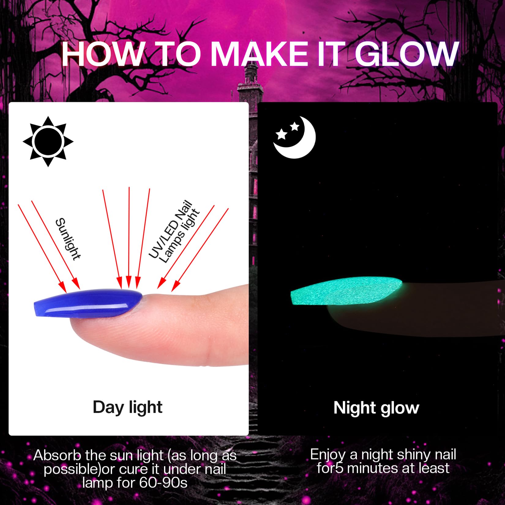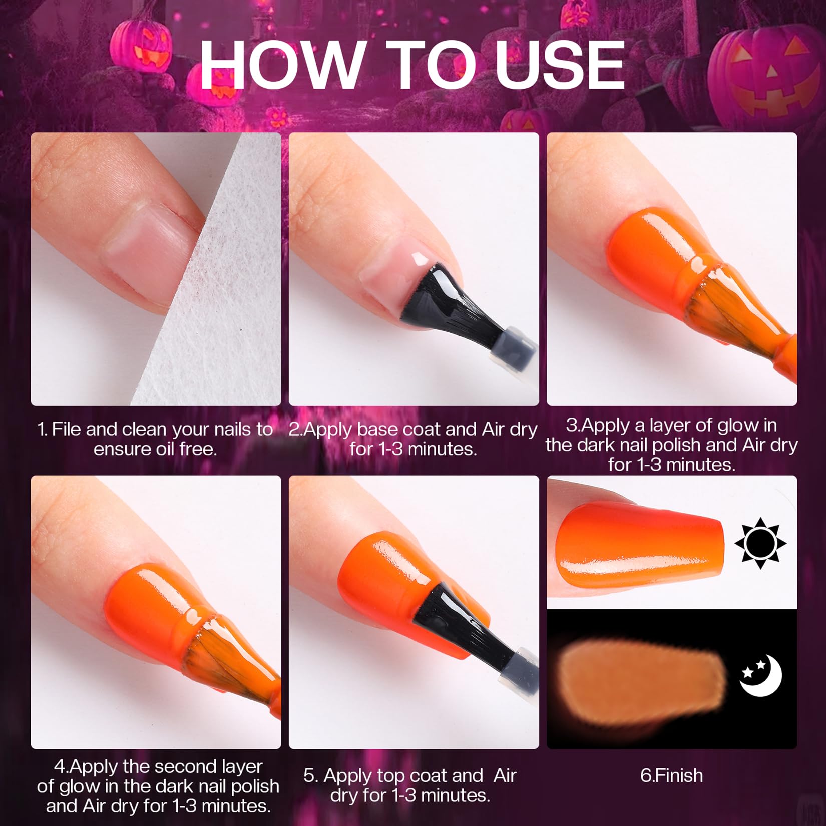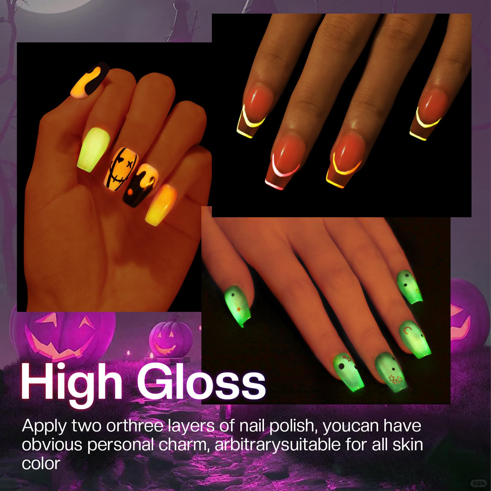 Glow In The Dark Nail Polish:the Halloween nail polish set mood with this fall nail polish set that's perfect for overnight parties. It's a vibrant neon nail polish color by day and transforms into a glowing luminescent shade at night.