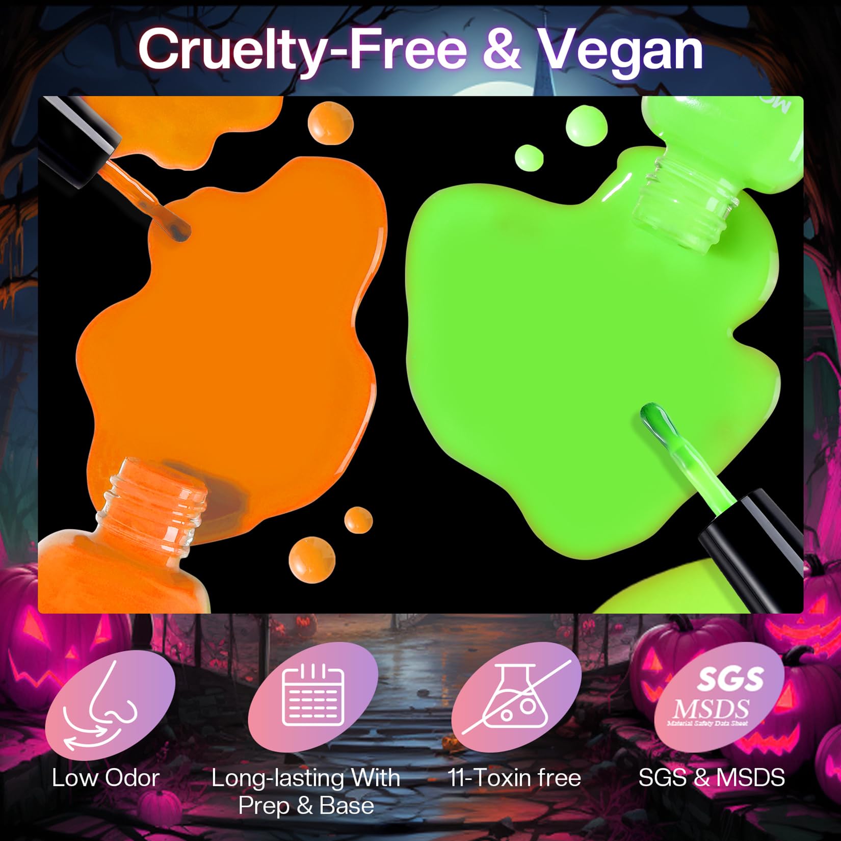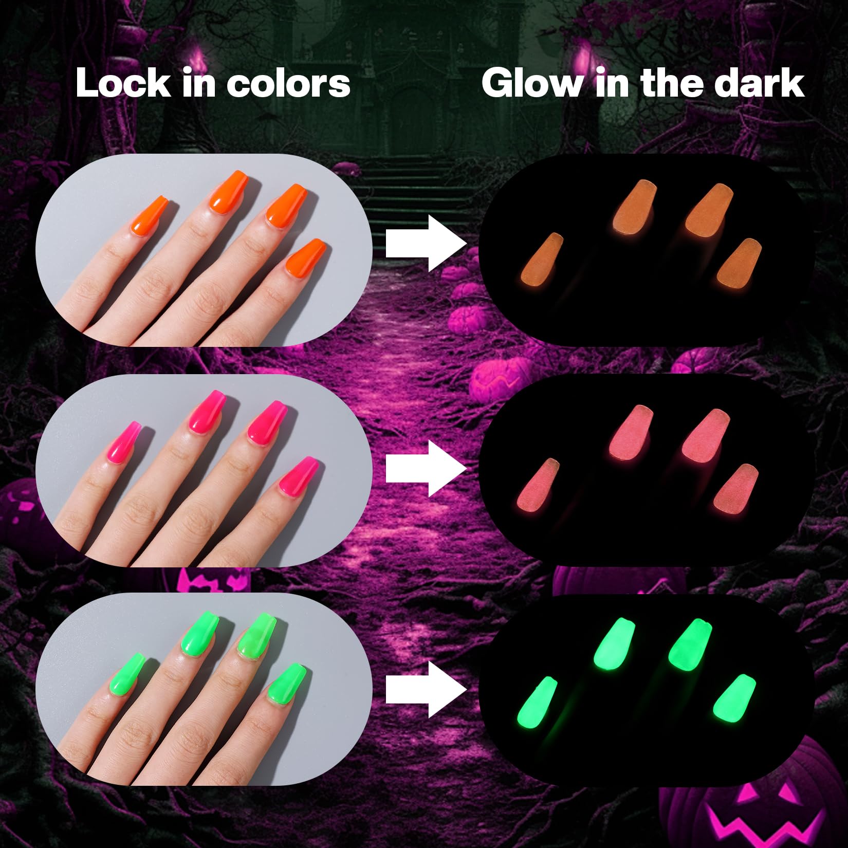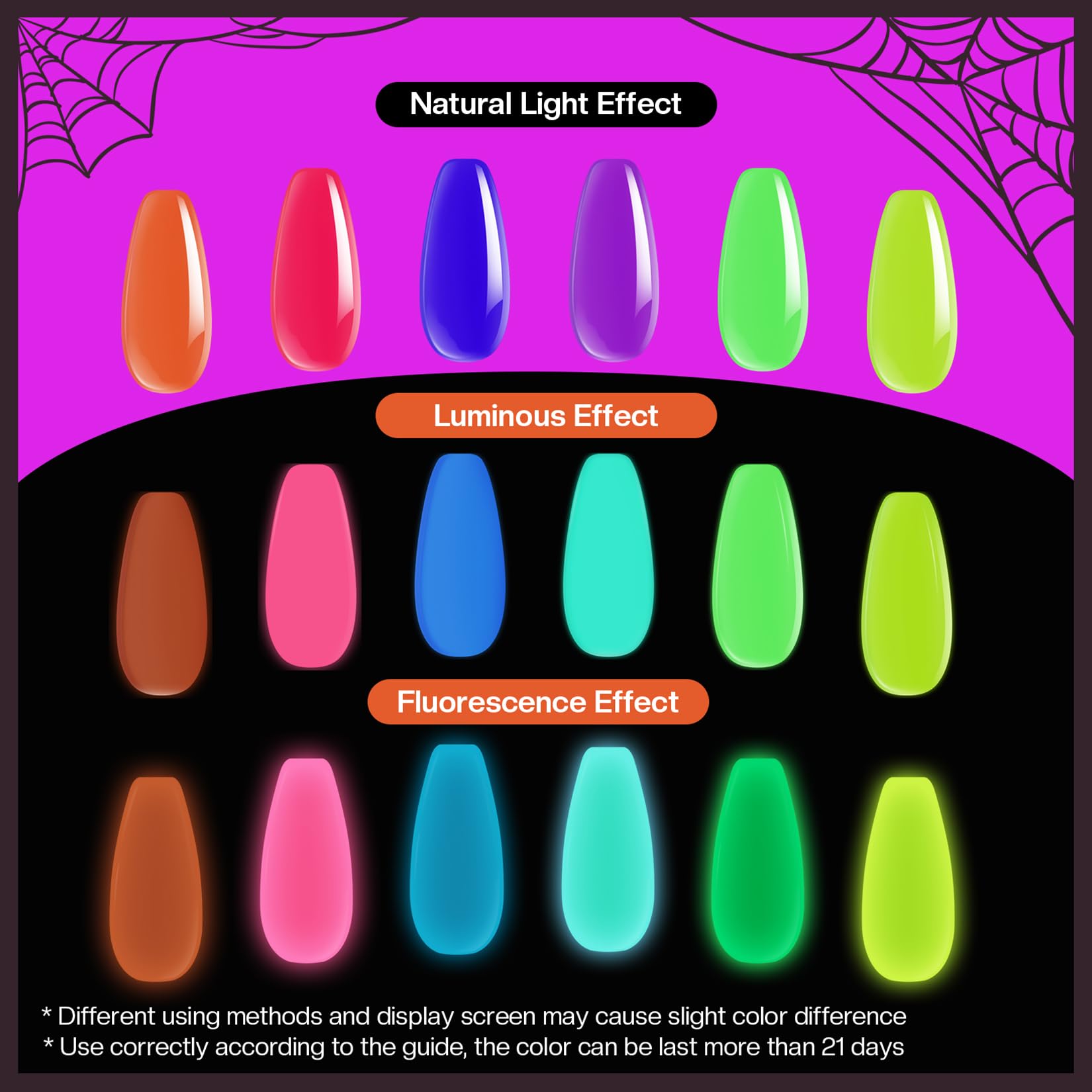Glow In The Dark Nail Polish:the Halloween nail polish set mood with this fall nail polish set that's perfect for overnight parties. It's a vibrant neon nail polish color by day and transforms into a glowing luminescent shade at night.