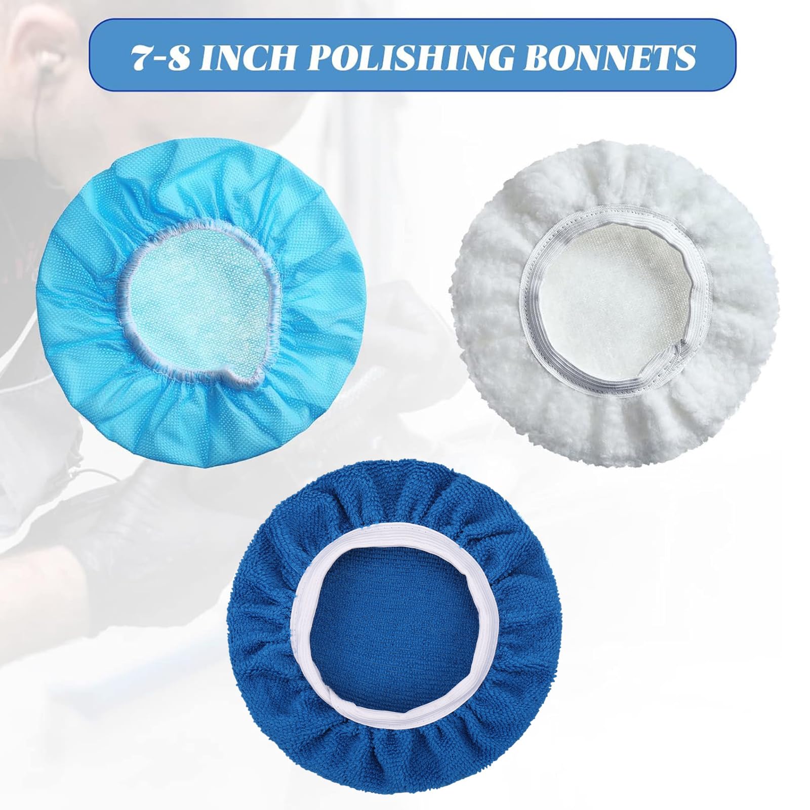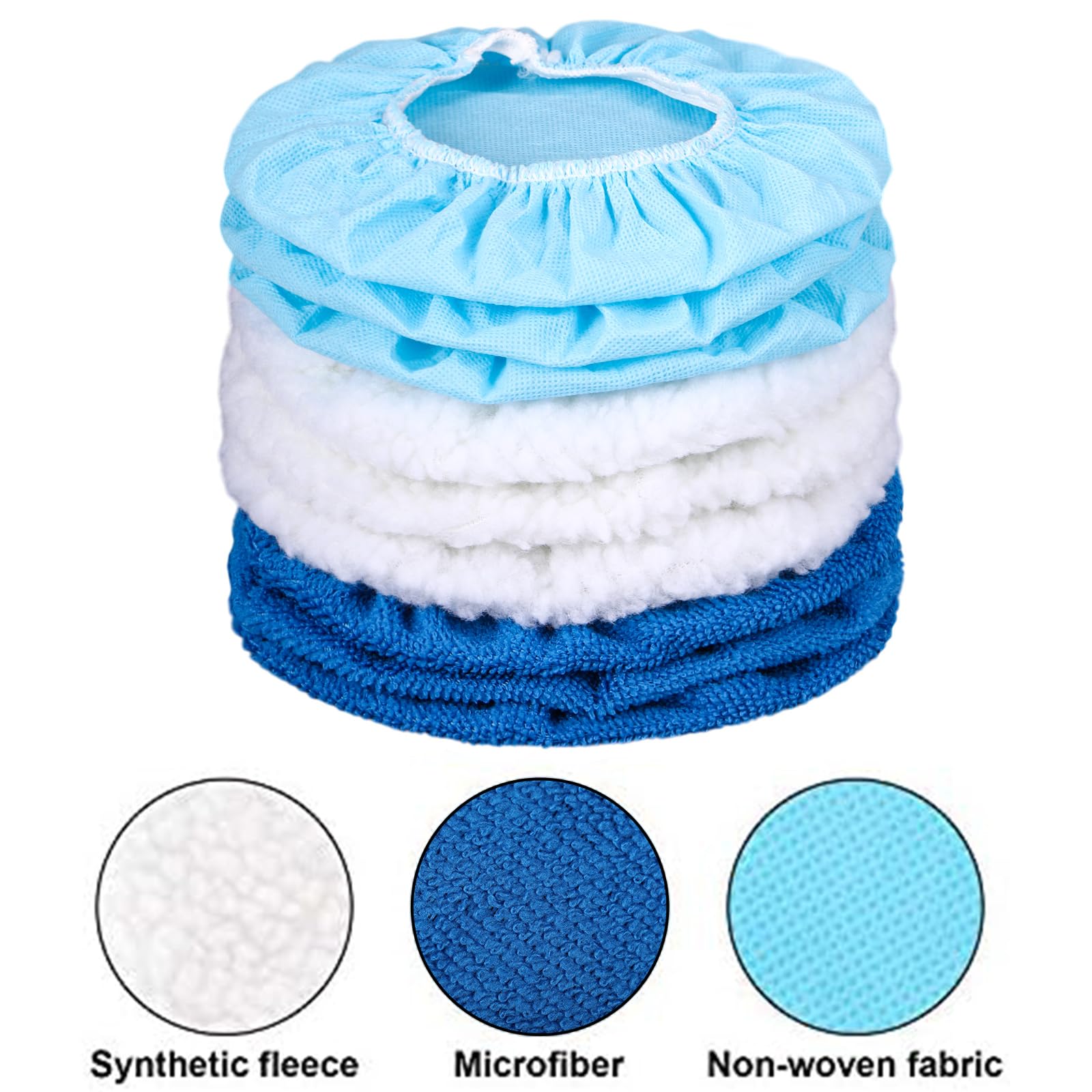 Features: Waxing, cleaning and polishing, soft material, no paint. Durable: The polisher pad bonnet set can be washed repeatedly, has a smooth surface and does not cause damage to the surface of the car. Specifications: Color: as show in the picture Size: as picture shown Quantity: 20 pieces Package includes: 12 x Microfiber polishing bonnet 4 x Wax applicator polishing bonnet 4 x Woolen fleece polishing bonnet