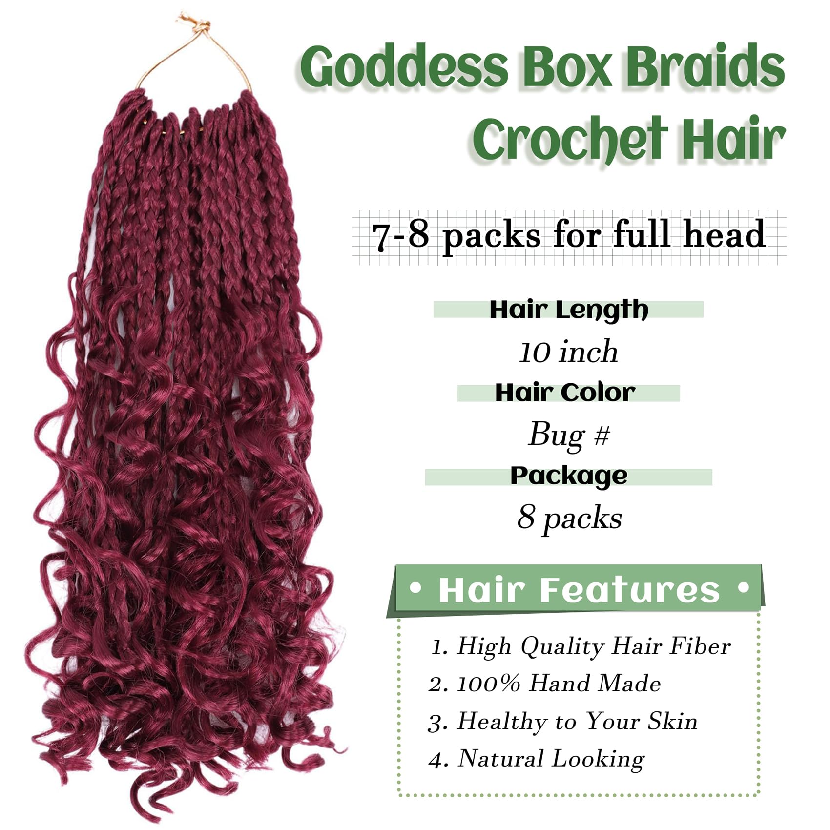 Hair Length and Package: goddess box braids crochet hair is 10 inch, 12 inch and 14 inch, 16 strands one pack, 8-9 packs are enough to make a full head. Hair Color:1B, #2 , #27 , #30 , 1B /27 color, 1B/30, T30/27,T30/613,Tgray color and 1B/Burgundy color. More colors are available.