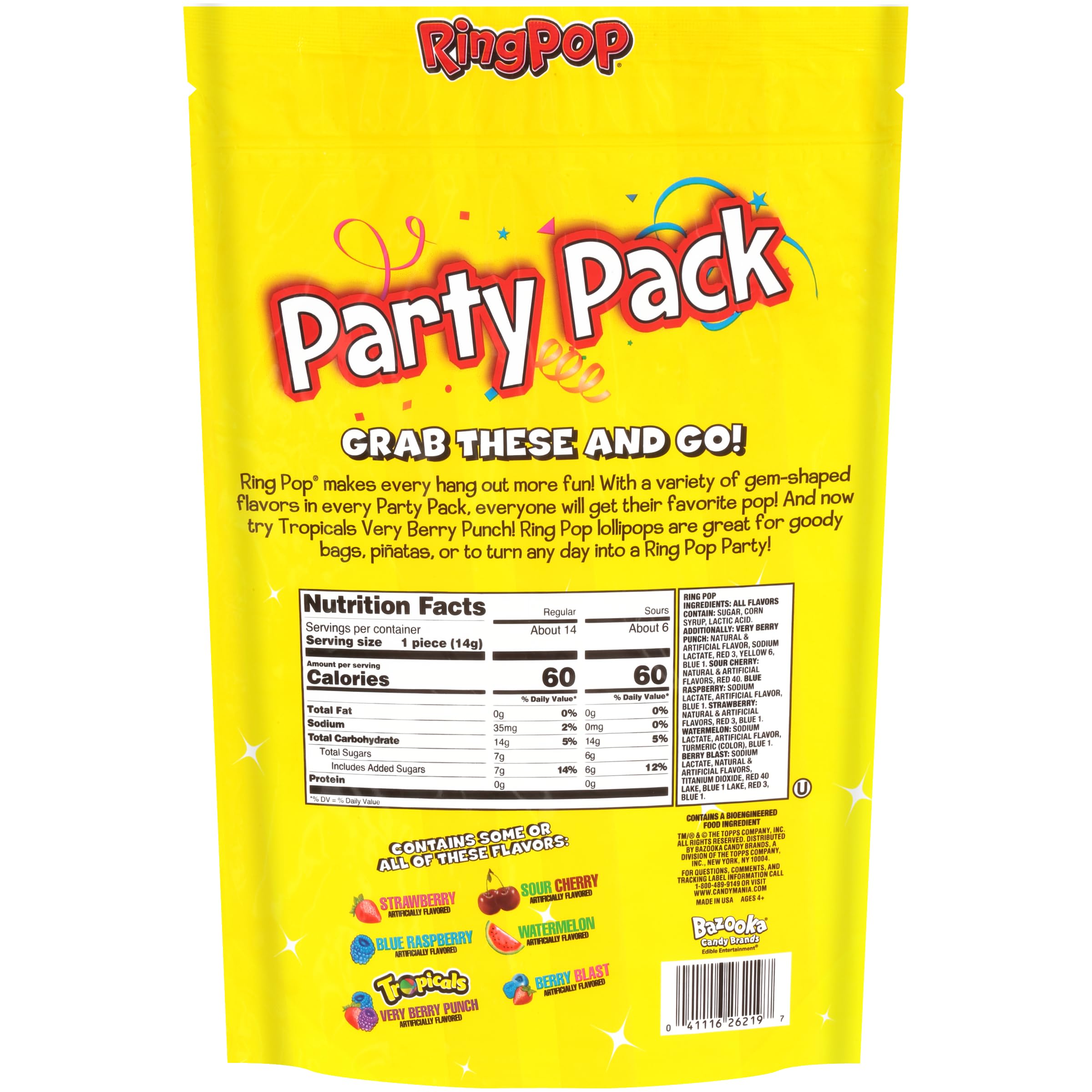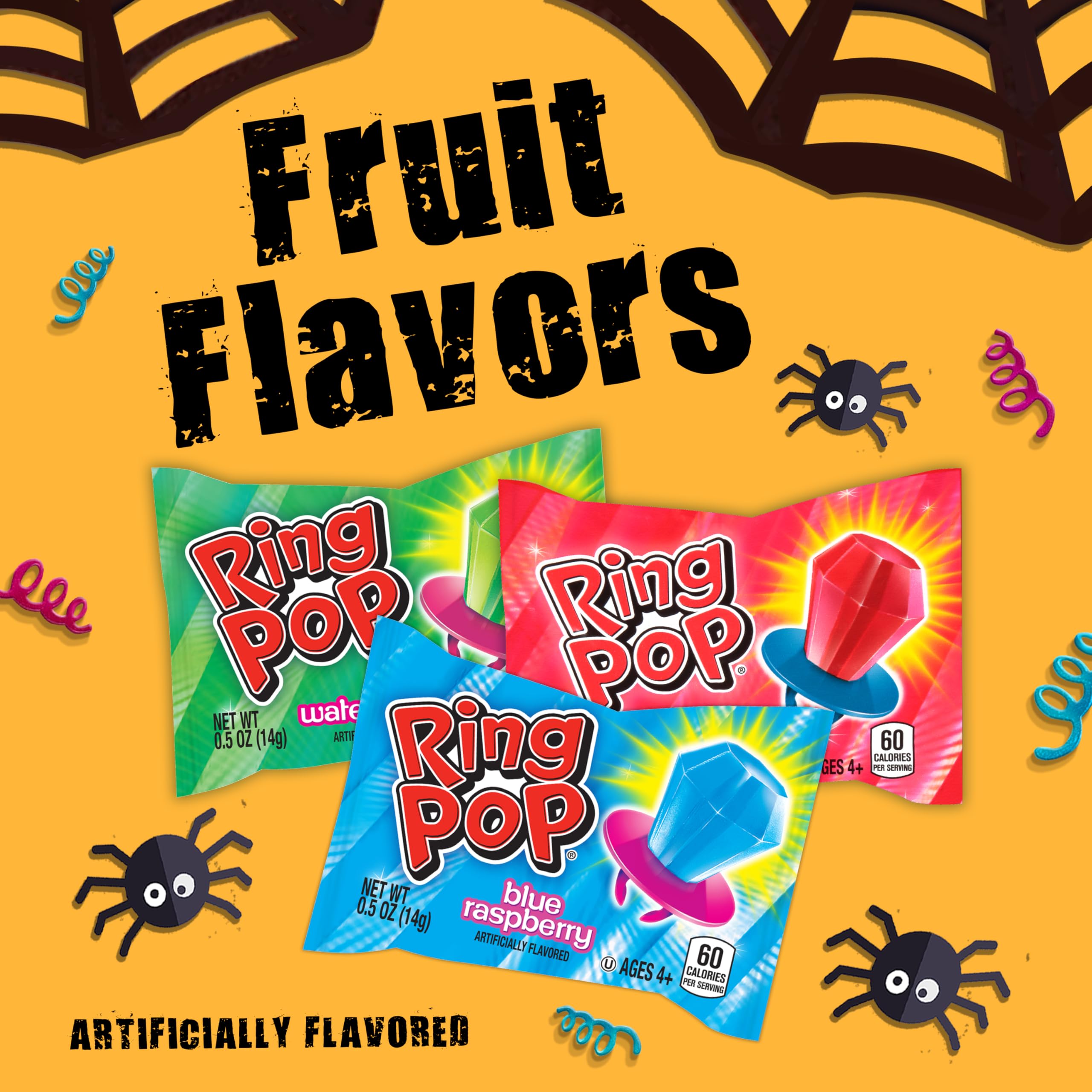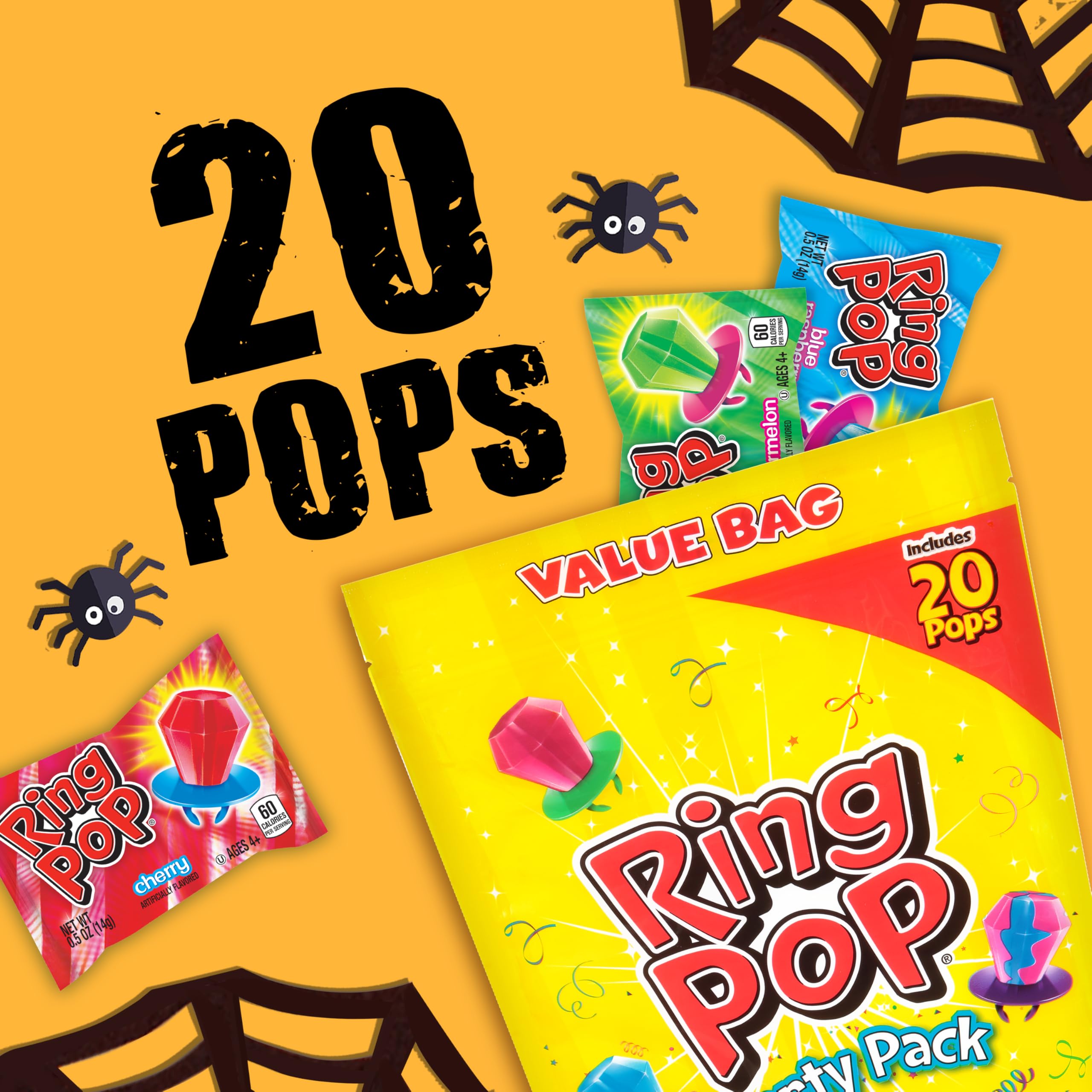 BULK LOLLIPOP BAG: 20 individually-wrapped shelf-stable Ring Pop lollipops per bag. The variety pack means there are different tasty flavors for everyone to enjoy, but enough to go around and share the fun together!