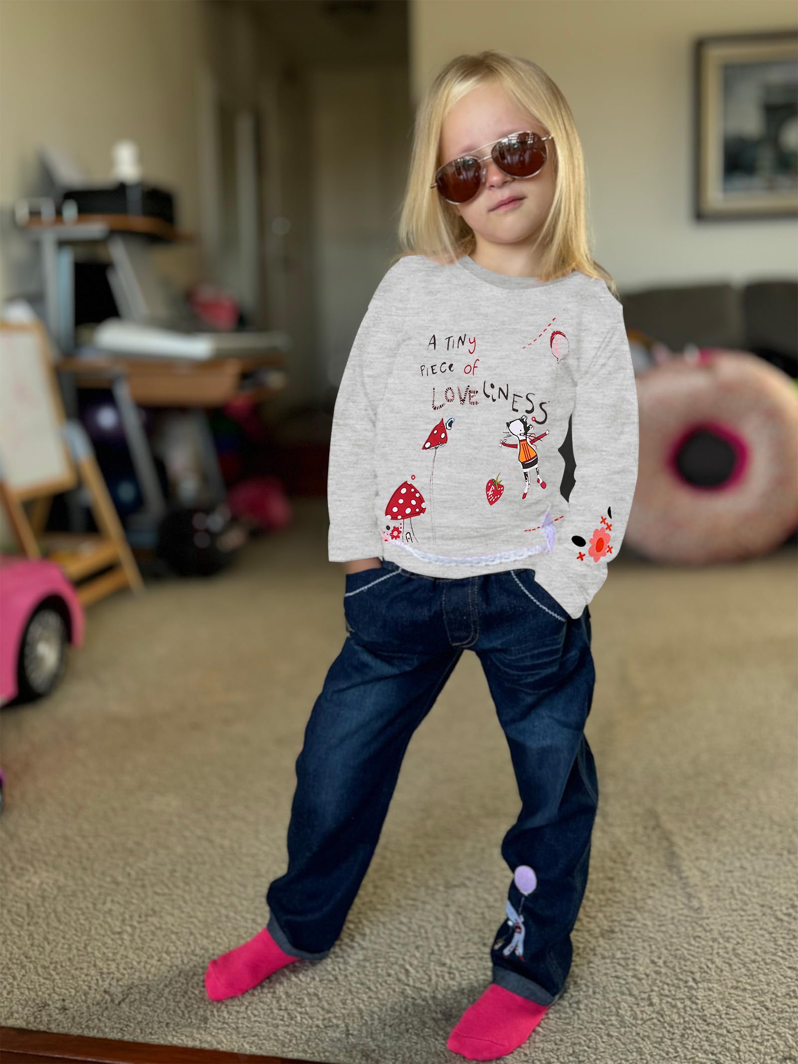 Unique Design: Toddler Girl Pullover Top is designed with crew neck, long sleeve, cute cartoon graphic, exquisite lace decoration. Jeans pants feature soft denim fabric, floral elastic waistband, cute embroidered print and two pockets. This lovely two pieces outfit will make your baby girl more cute and flattering.