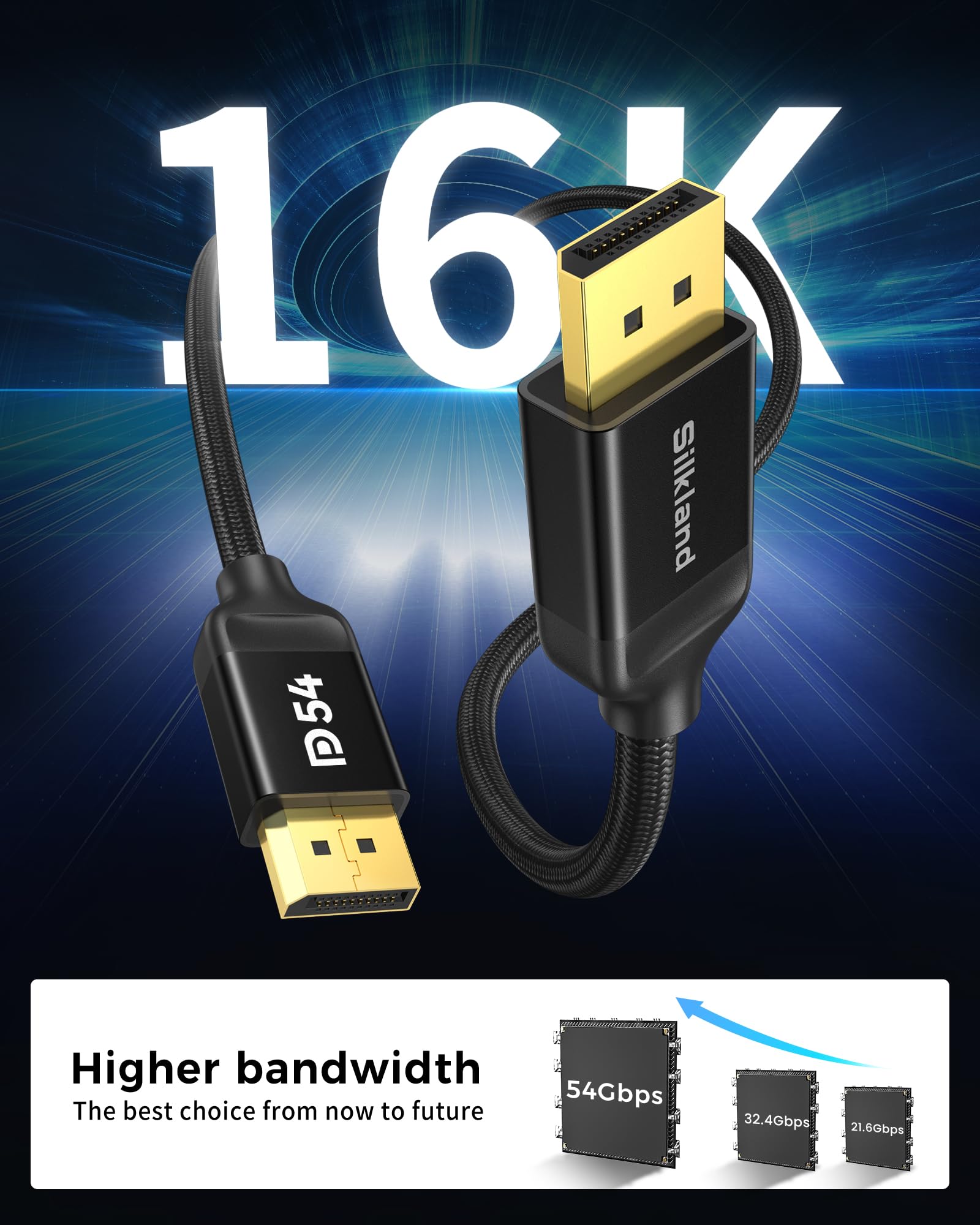 【Ultimate Gaming Experience】Silkland 16K displayport cable supports all popular graphics cards and monitors. Unlike 4K/8K DP cables, 16K displayport 2.1 can provide 54Gbps bandwidth, HBR3, DSC 1.2a. Dynamic HDR enhances dark scenes and details. The 32-bit audio captures enemy footsteps and breathing, especially in FPS and 3A masterpieces. Experience the thrill of multi-screen gaming with MTS multi-stream transmission. This is your all-in-one DisplayPort cable for the next decade