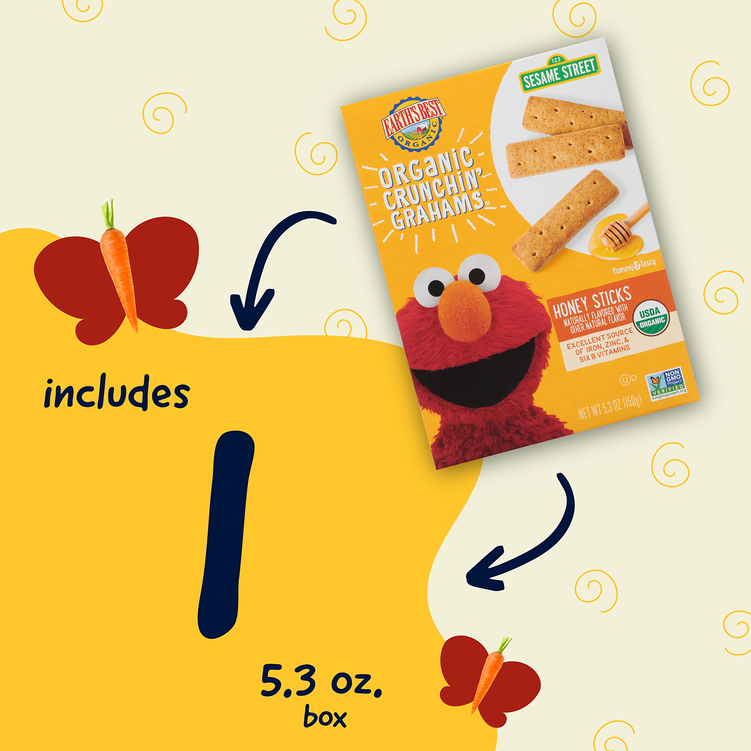 Product Description Earth's Best Organic is bringing play time to snack time with our range of tasty toddler crackers, cookies, smoothies, and snack bars inspired by your little one's favorite Sesame Street characters. Our snacks combine good-for-you ingredients with exciting shapes and flavors for a tasty treat that's both parent and toddler-approved. Your tot will love the classic flavor combinations in our PB&J Bites, staying mess-free and full on the go with our Sunny Days Snack Bars, or crunching on these delicious graham cracker sticks! Made with a blend of certified organic ingredients, our Organic Crunchin' Grahams do not contain artificial flavors or colors − so you know your toddler is getting the wholesome support they deserve with every bite. Wholesome flavor, wholesome fun− that's what makes us the Earth's Best brand. Brand Story By Earth's Best