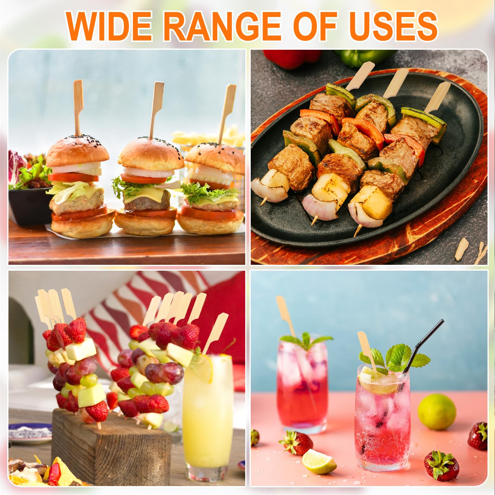 MAKE YOUR PARTY FOOD MORE APPEALING: Our long bamboo skewers are longer and sturdier than ordinary wooden skewers. Therefore, they can hold more appetizers, fruits and vegetables, or thicker sandwiches and hamburgers. You can use them to handle a large amount of food and create more elaborate cocktails and mixed drinks. Make your party food more appealing and leave a deep impression.