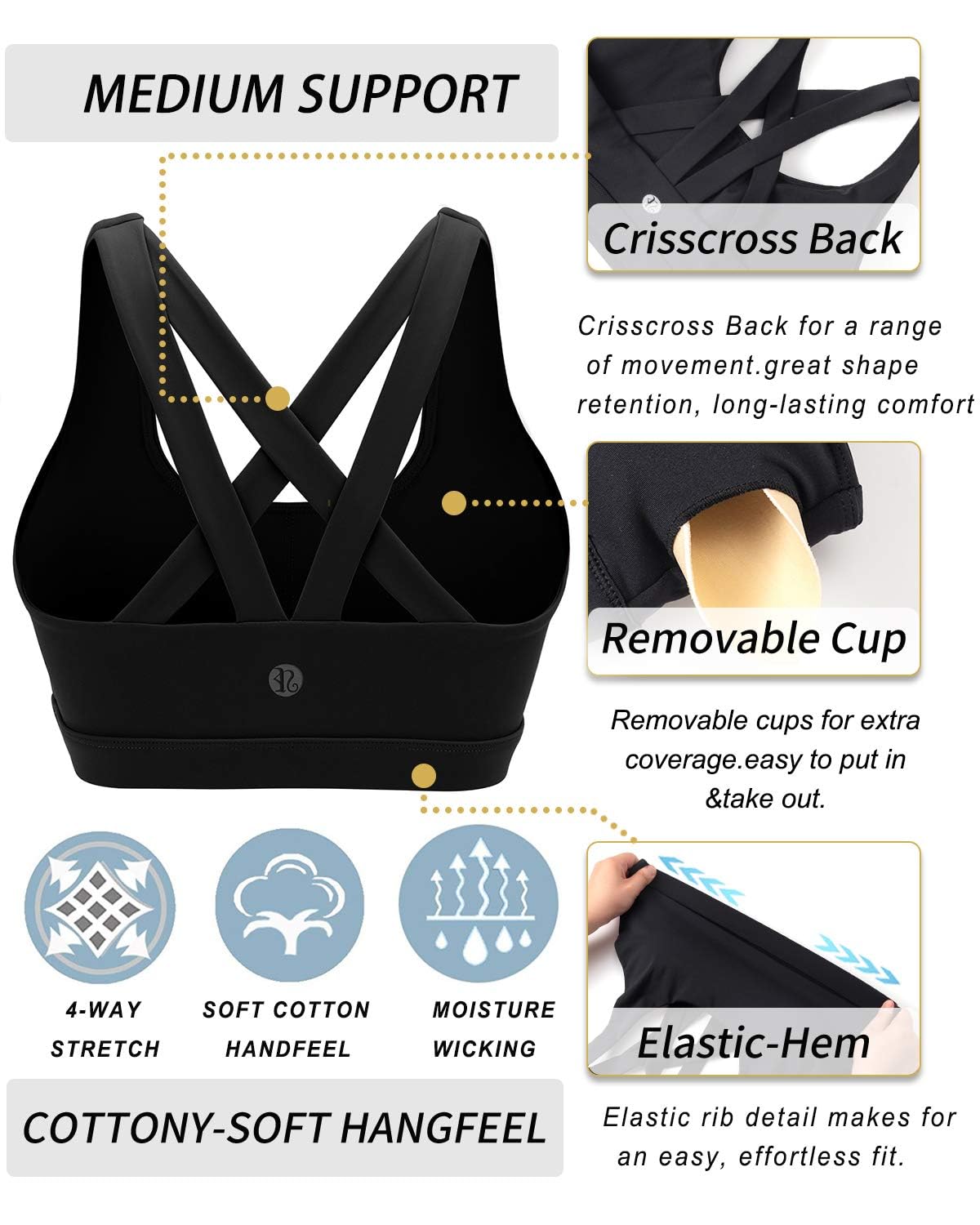 WHY WE MADE THIS:Need a sports bra that does it all? Look no further! This sweat-wicking cross-strap bra gives you the coverage and support you need for yoga, run, and the gym—without restricting your movement or breath. fabric has added lycra that allows the bra to stretch with you and retain its shape over time. Slip in optional, removable cups for full coverage—if you want it. This bra is intended to provide medium support for great shape retention, long-lasting comfort.