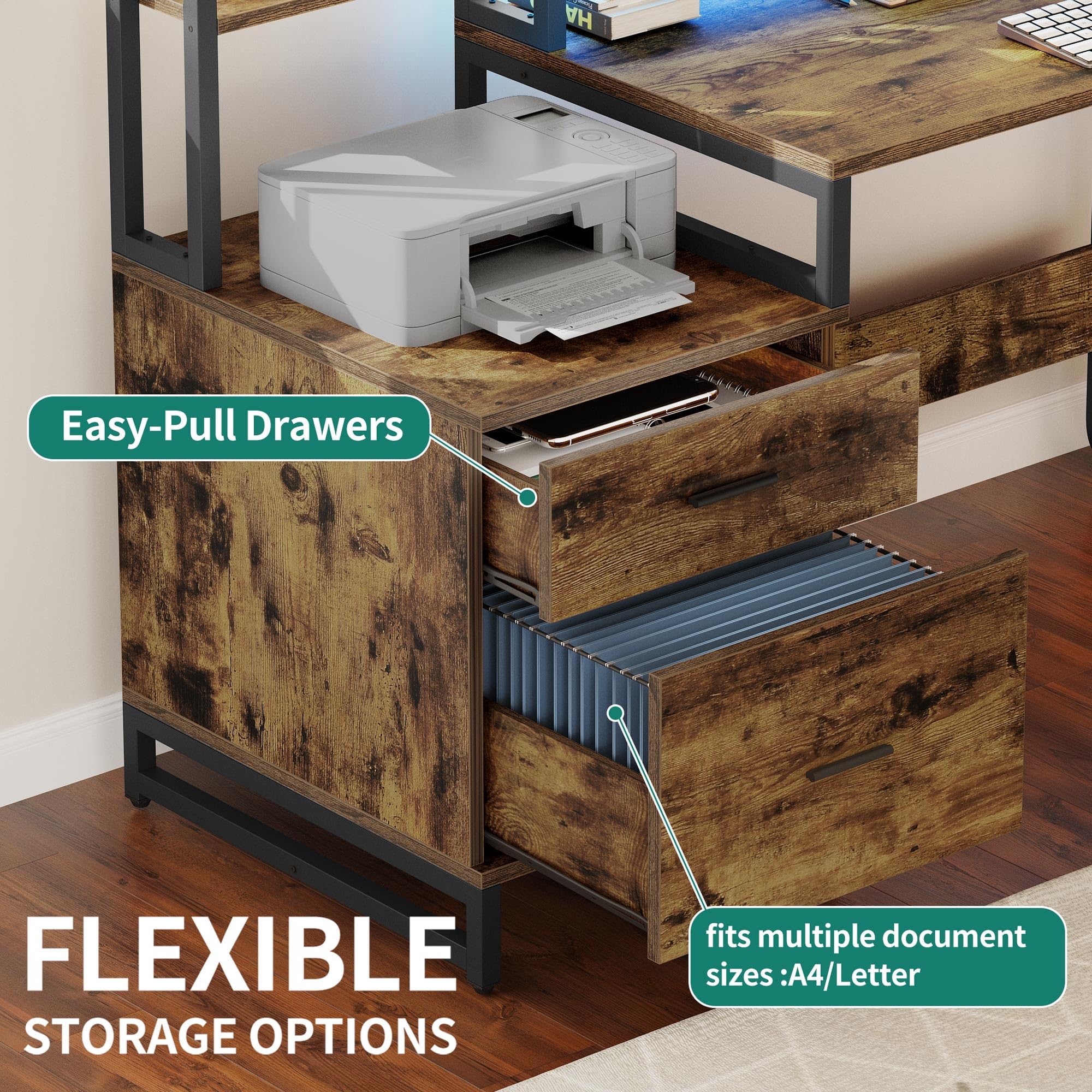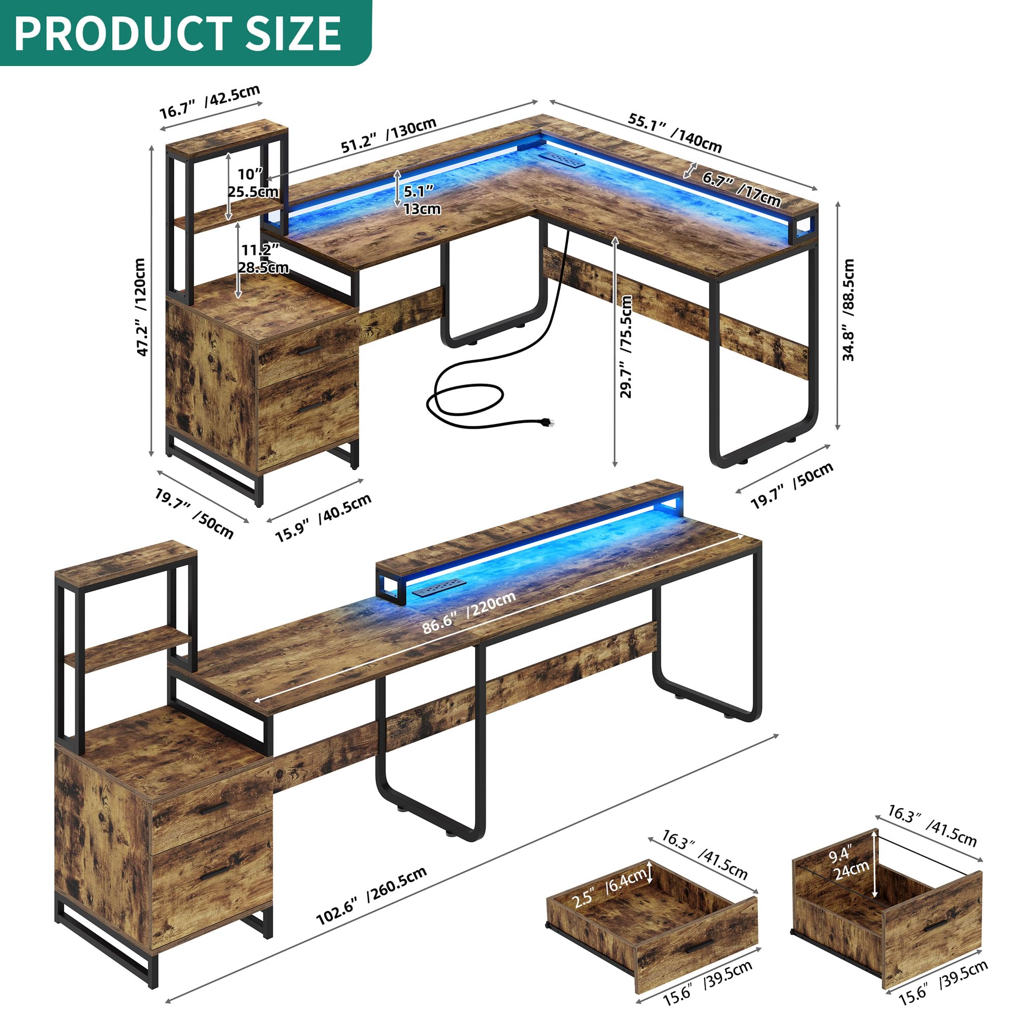 L Shaped Desk with Power Outlets: DWVO computer desk with drawers features 4 power outlets, 2 USB ports & a 6.56ft power cord to charge your phones, laptops, printer, gaming gear and other office devices, making your life easier