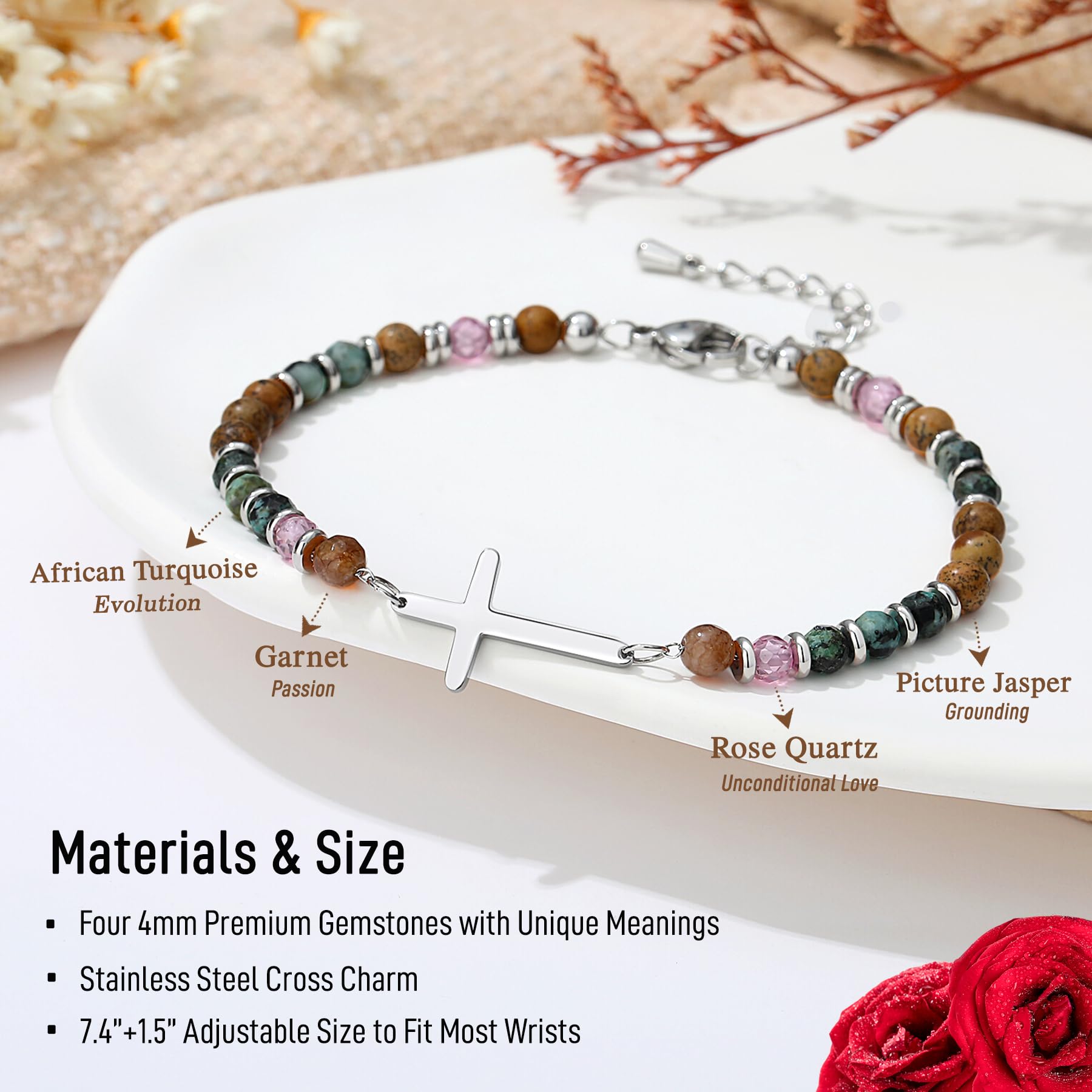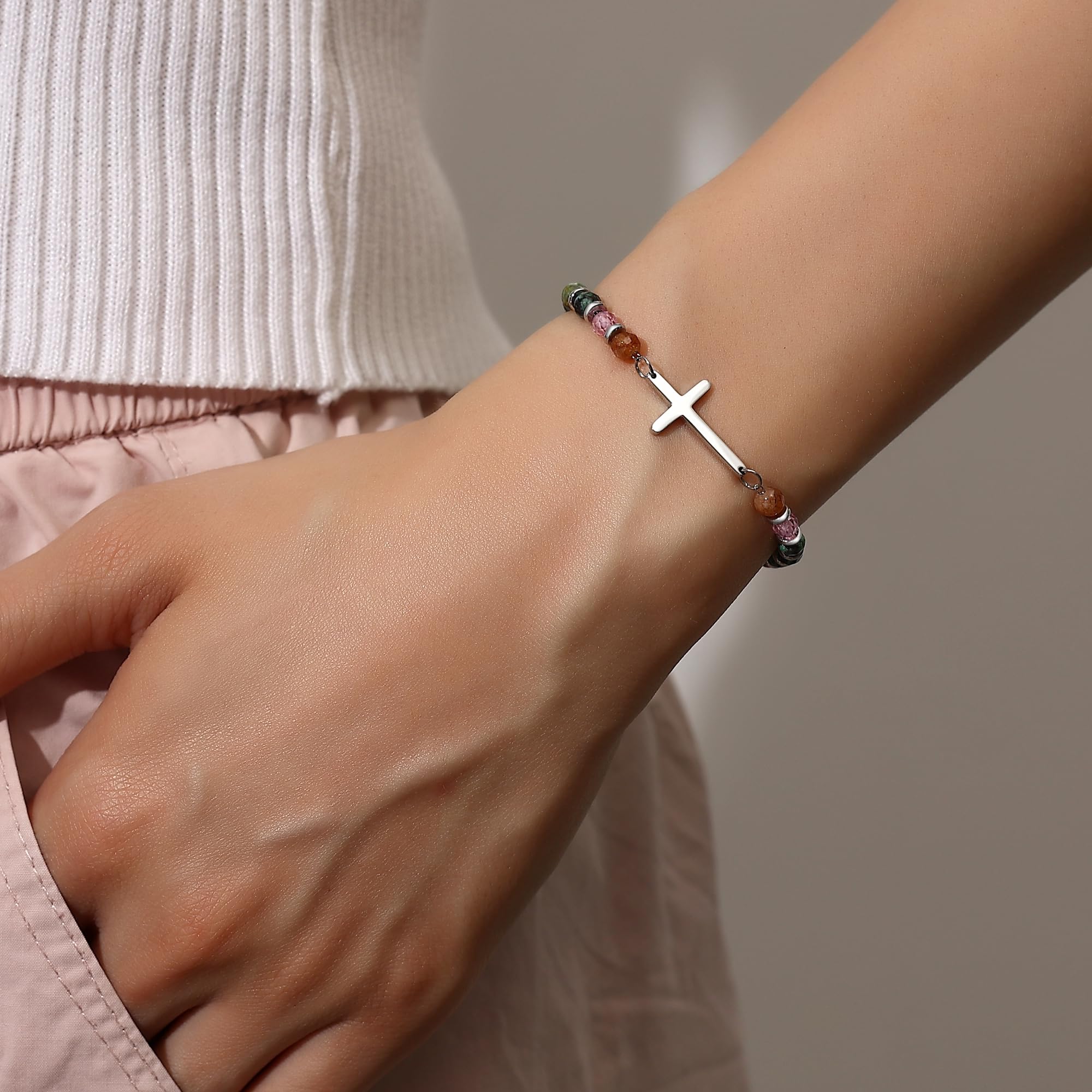 【 Premium Quality & Adjustable Size 】Crafted for comfort and durability, this 7.4" beaded cross bracelet for women features a 1.5" extension chain for an adjustable fit (6.5"-8" wrists). Handmade with 4mm colorful natural stones and hypoallergenic 316L stainless steel beads, it’s lightweight, tarnish-resistant, and perfect for daily wear. The stones offer symbolic meaning while the cross adds spiritual protection—a beautiful blend of faith and craftsmanship in this essential piece of faith jewelry.