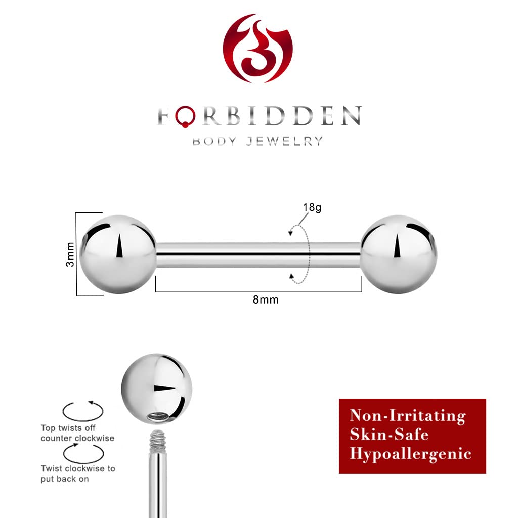 Forbidden Body Jewelry suitable for a wide variety of piercings - suitable for your tongue, nipple piercings, eyebrow, belly button, daith/rook/snug, vertical labret and all intimate piercings. Nipple barbells are externally threaded and both balls are removable for easy on and off.