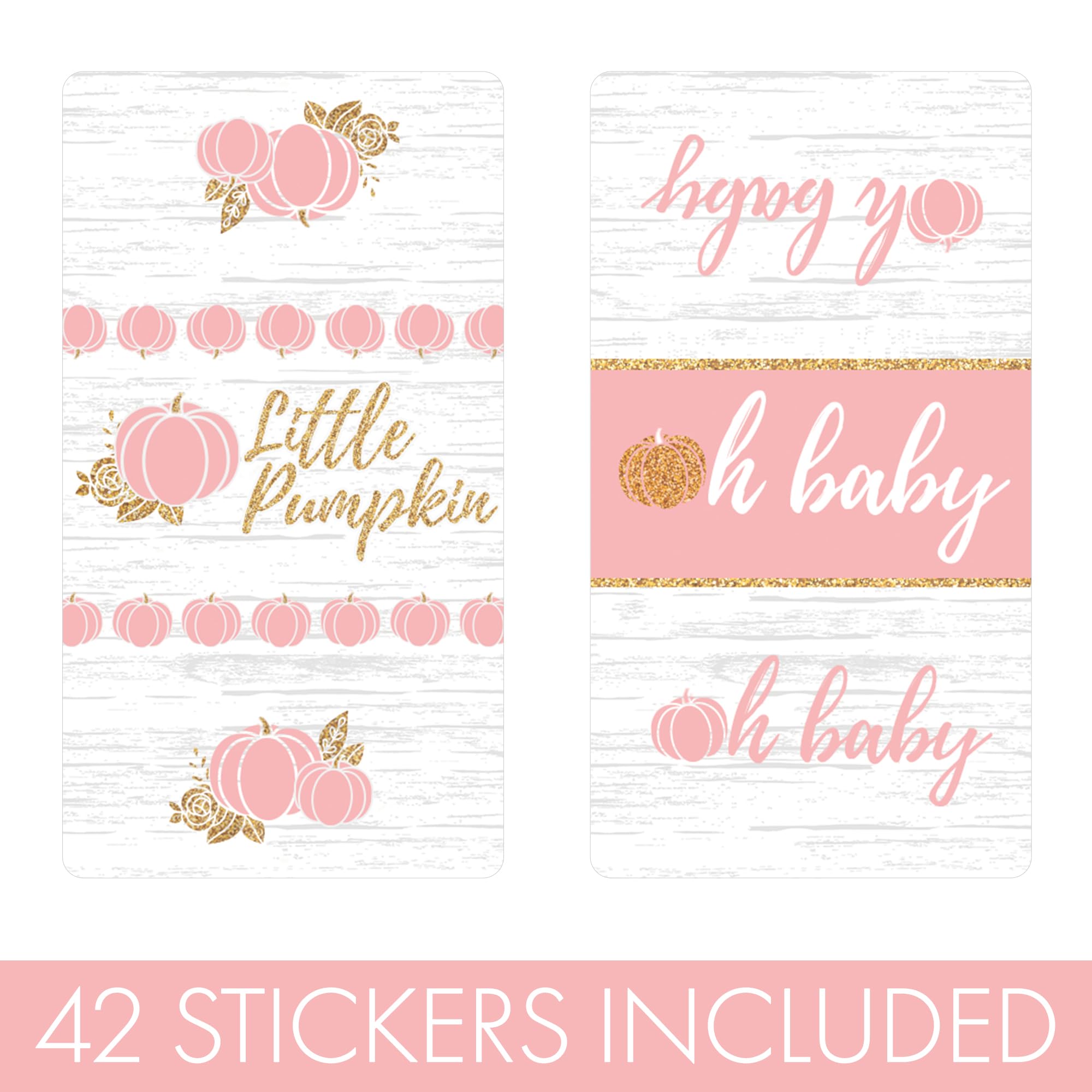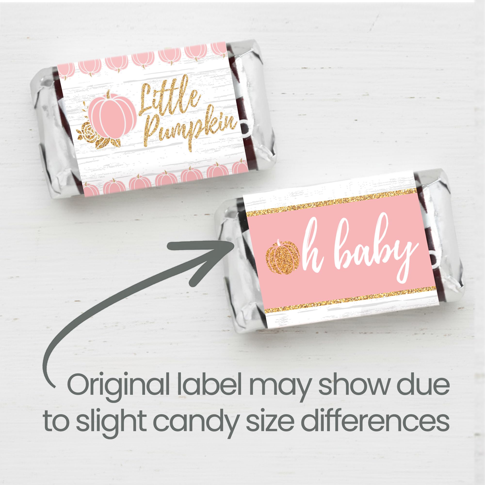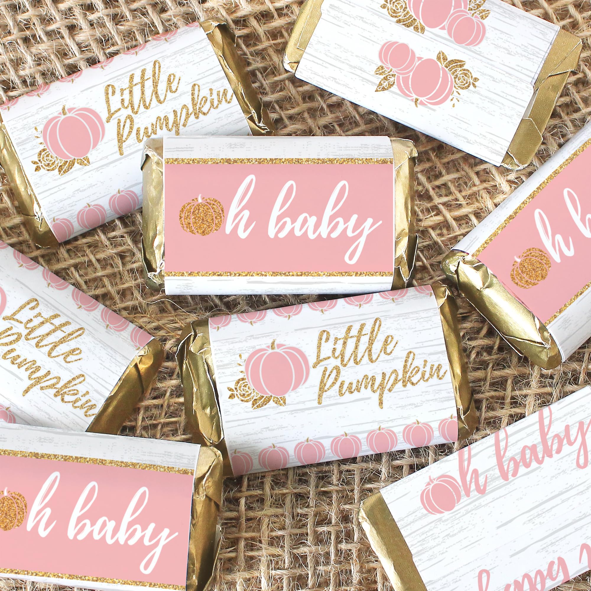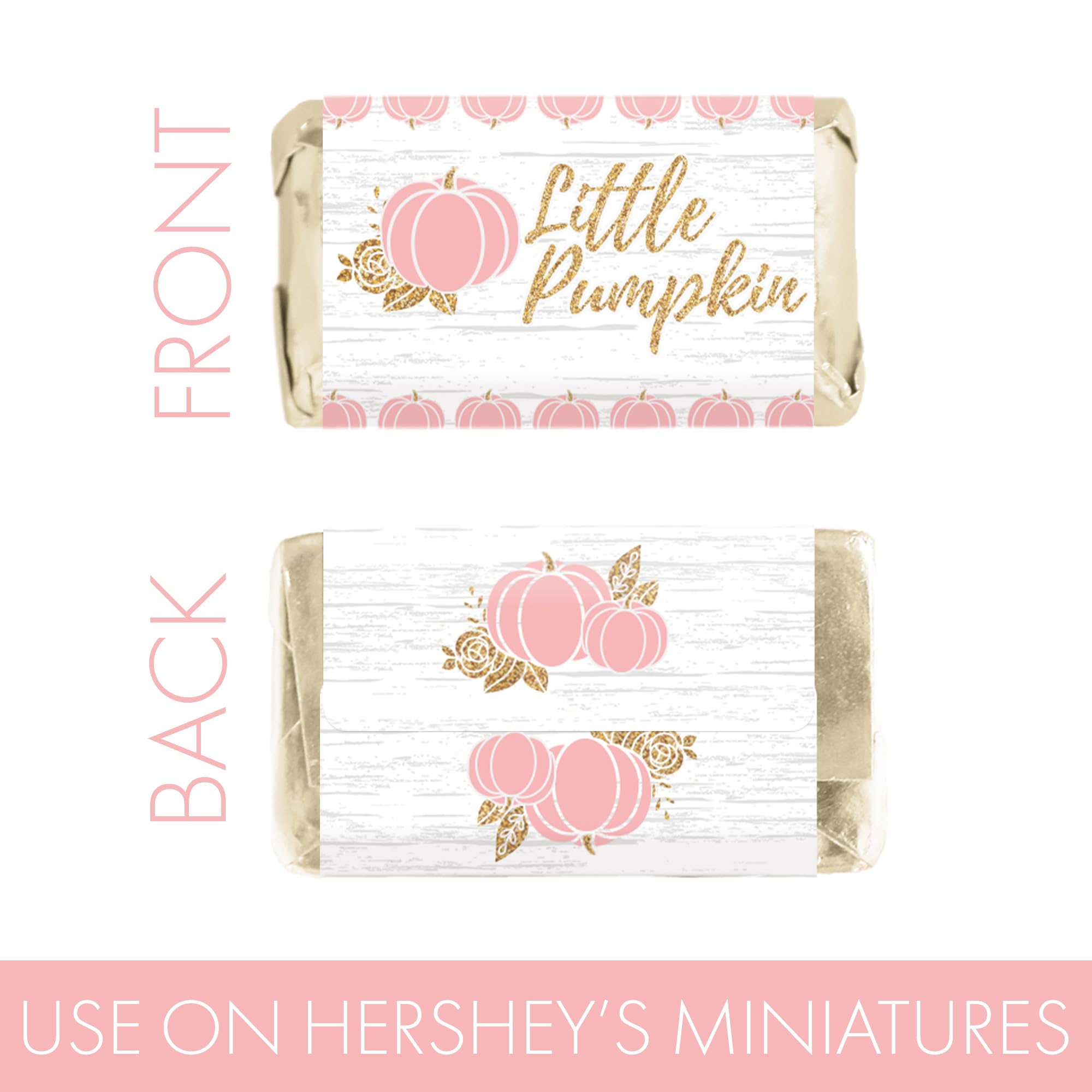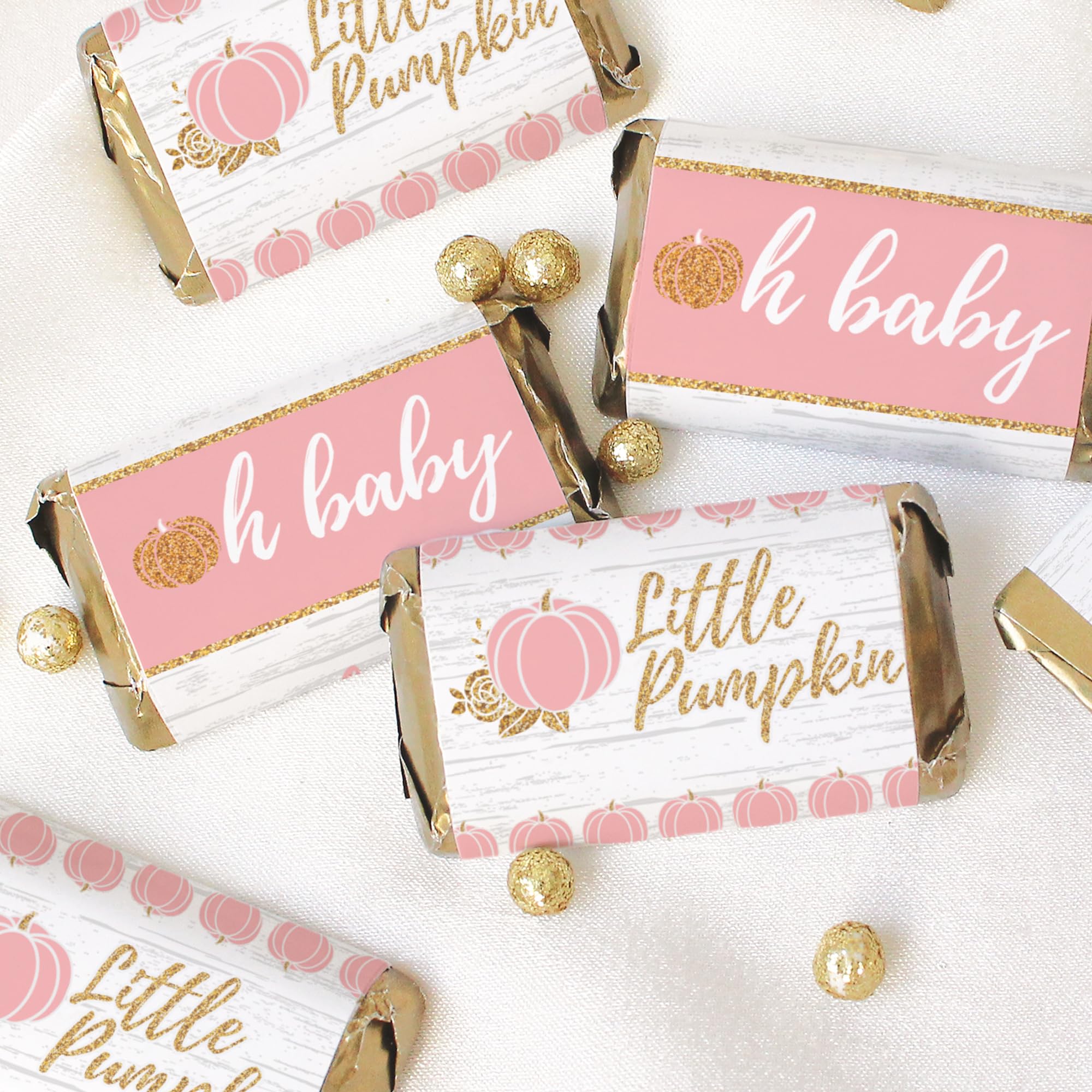 42 STICKERS: Pink little pumpkin baby shower miniature candy wrappers feature pink pumpkins and soft autumn colors for a seasonal baby shower celebration.