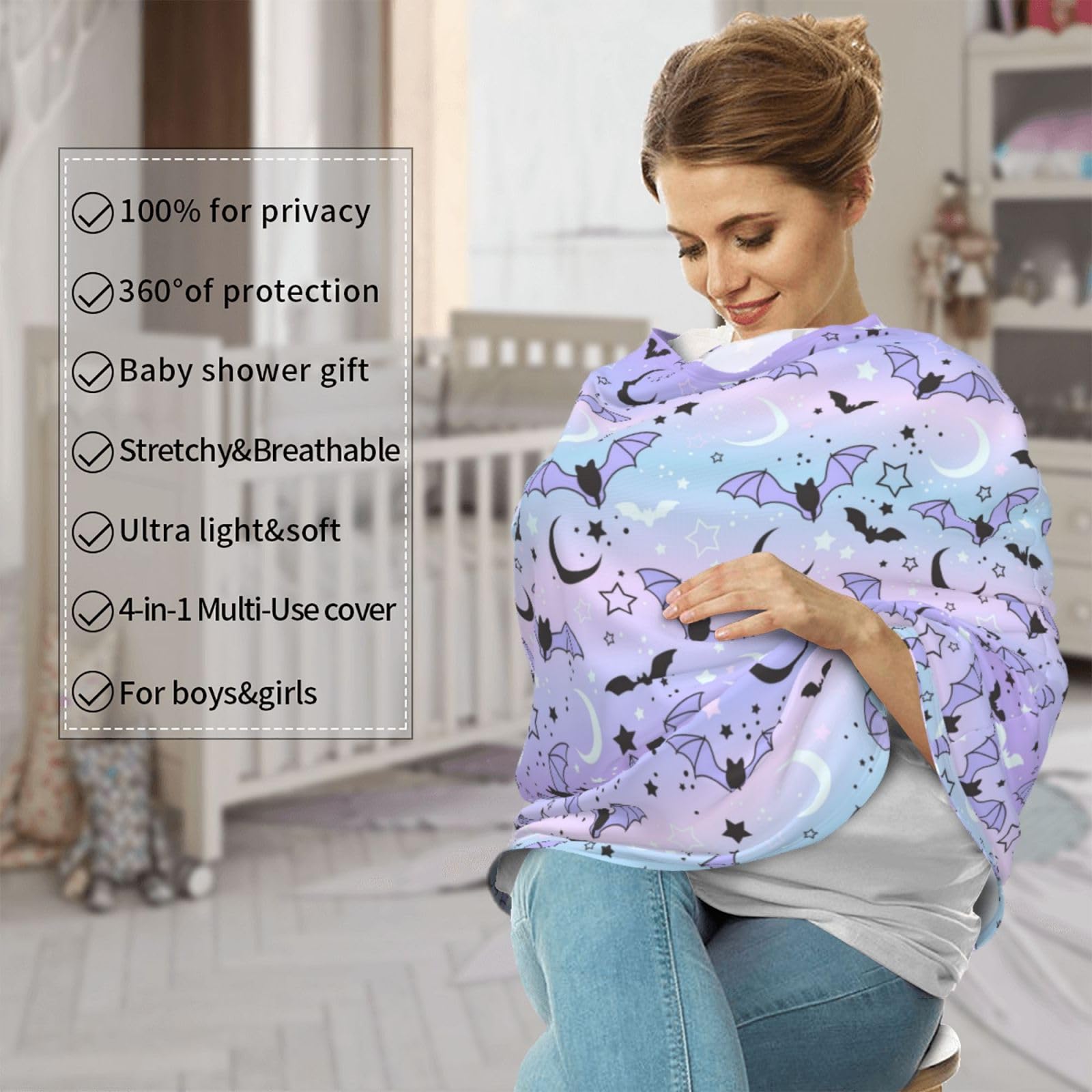 PRATICAL GIFT : With cute halloween bat moon star prints, gender-neutral style, and multiple uses. our nursing covers will make a thoughtful gift for mom-to-be or new parents at a baby shower, birthday, and other special gifting occasions. Suitable for boys & girls.