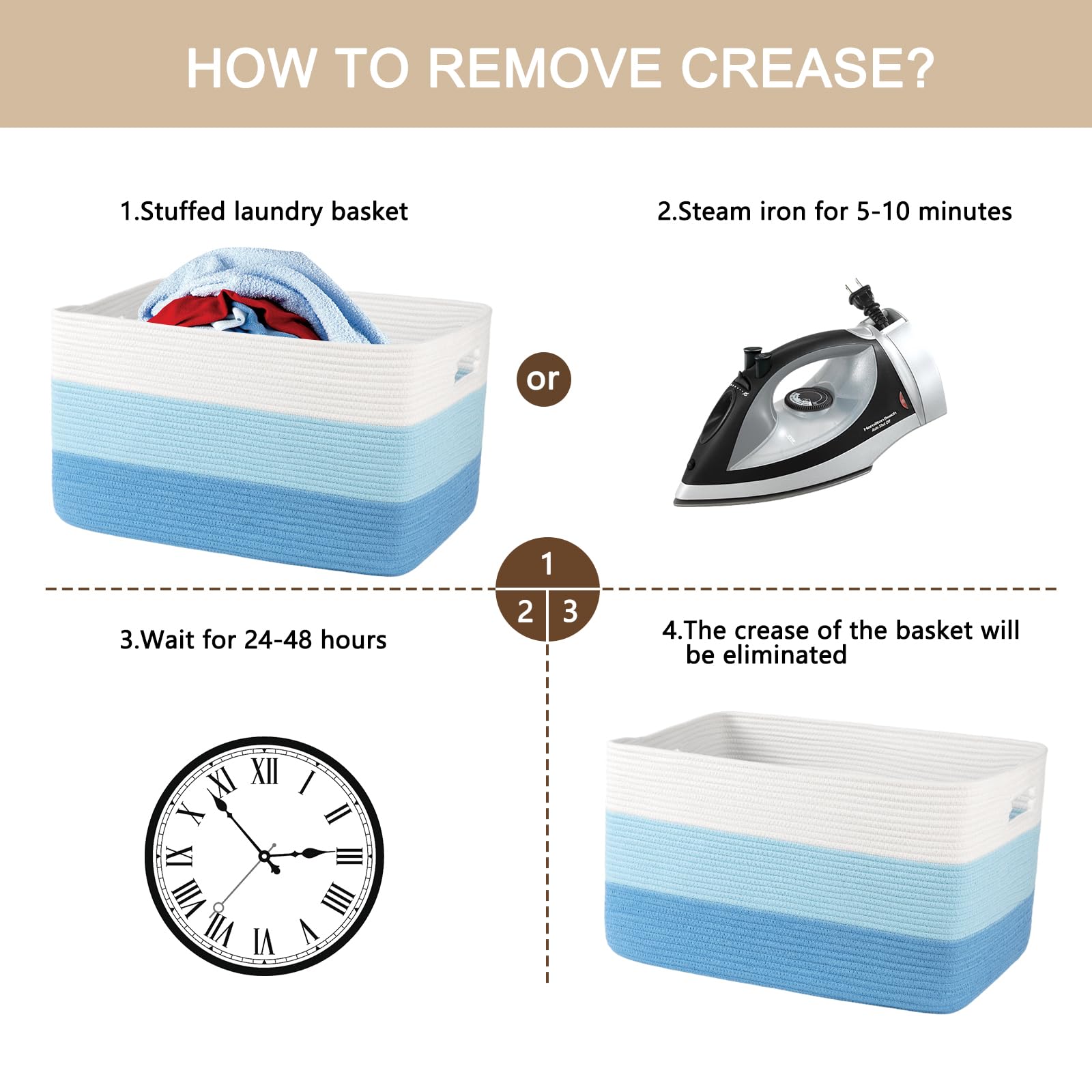 Washable Large Basket: This large basket can be washed by hand or machine with gentle detergent. If machine washed, please put them into a laundry bag. NOTE: These cotton rope baskets are folded when shipping, but it will turn back to its elegant shape quickly if you fill it with some towels or clothing, and iron is great idea to remove the creases