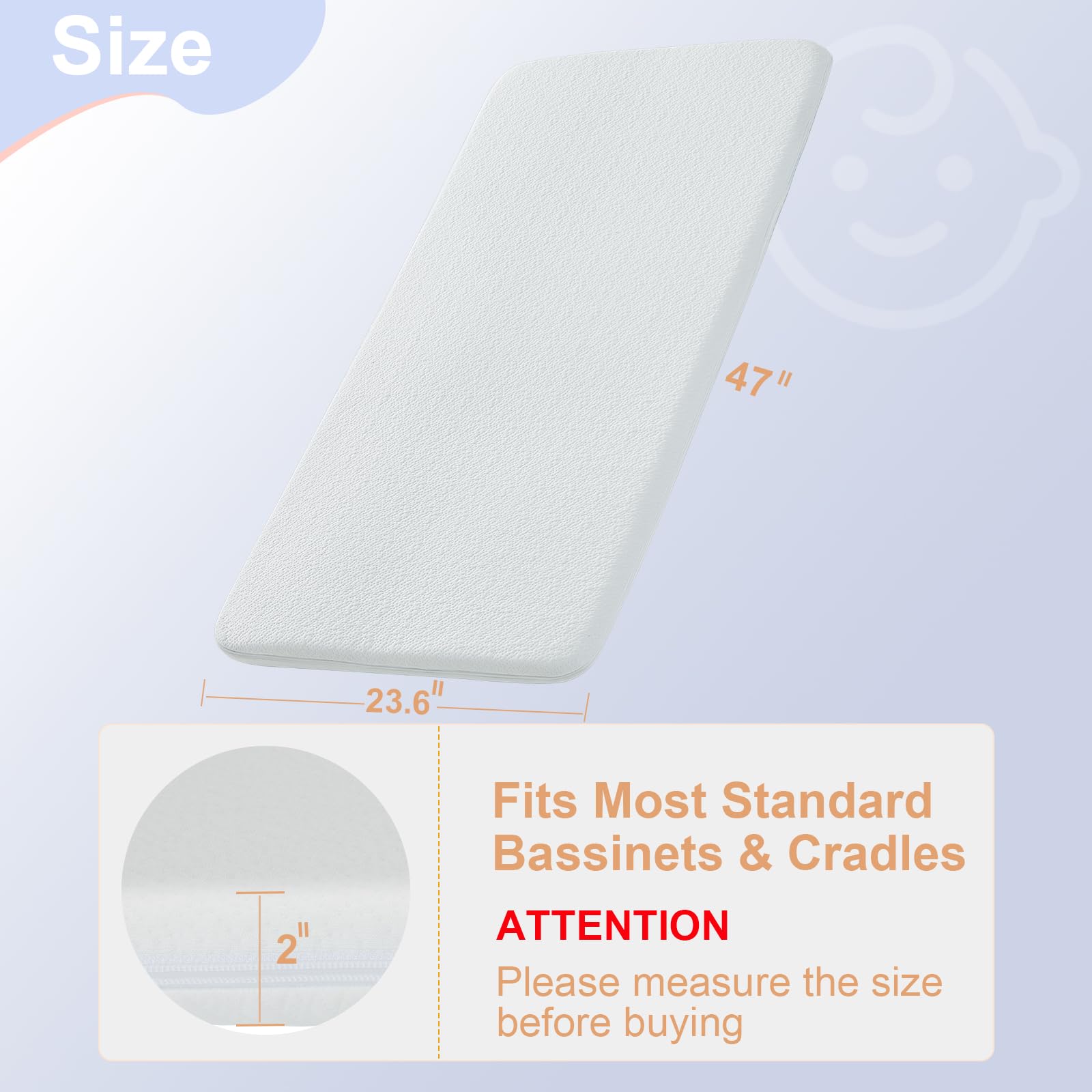 【Suitable for】This bassinet mattress compatible with ADOVEL, BabyBond, ANGELBLISS, ELEMARA Bassinet Bedside Crib. The bassinet mattress measures 47" x 23.6" x 2''. Please measure your bassinet mattress before purchasing.