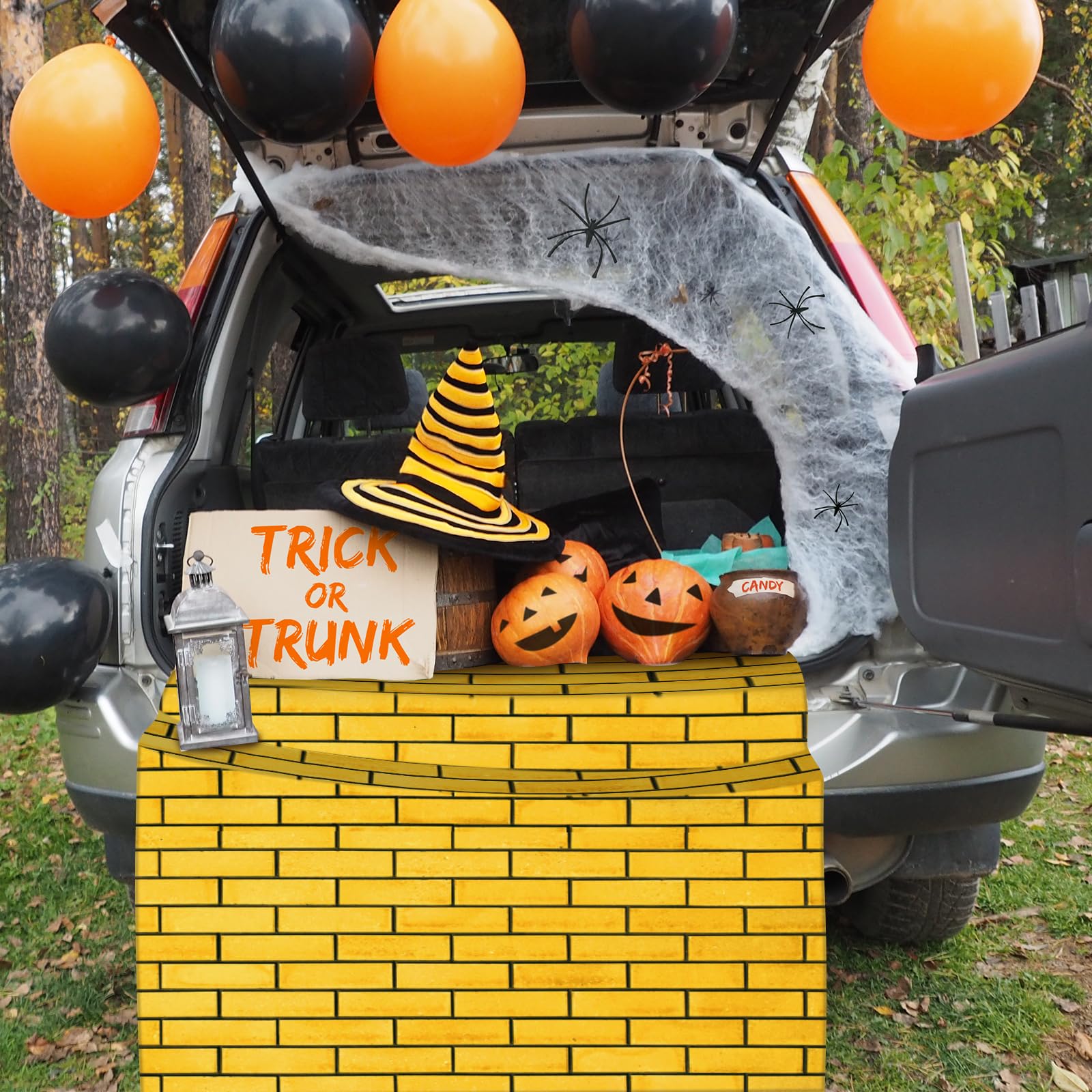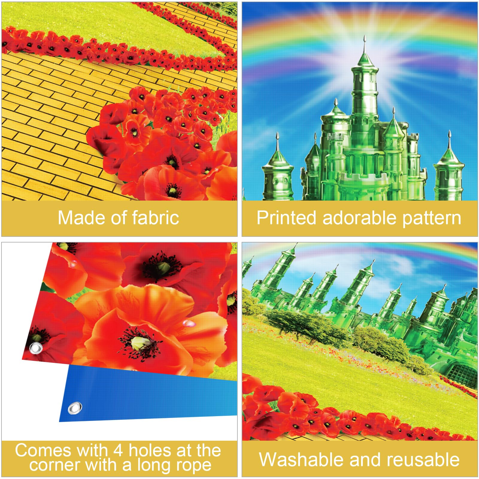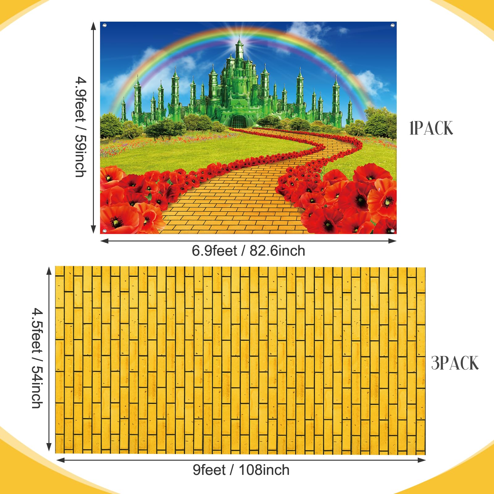 Large size: yellow brick stone floor road measures approx.4.5 x 9 Feet per each piece,3 pieces is total 4.5x27ft,emerald castle backdrop,measures approx 6 x 3.6 ft, the rope measures 20 ft long, which can be easily hung on the wall, door or anywhere you want.