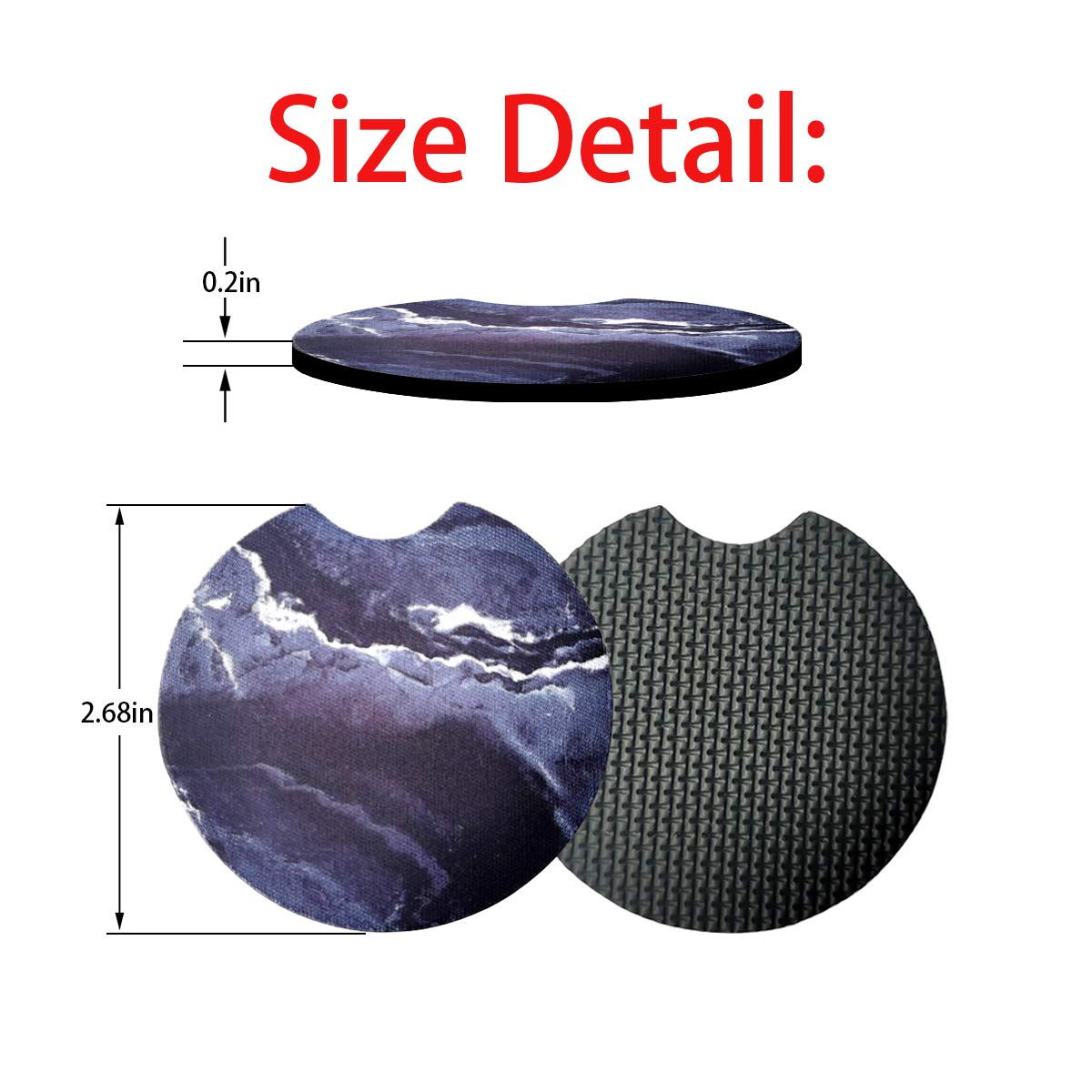 Colour and Size:A variety of colors for you to choose.These are sold in a set of 2 and measure 2.75 inches in diameter and are 0.16 inches in thickness.The car coasters are a universal size, but we still recommend measuring for your vehicle as every car is different.