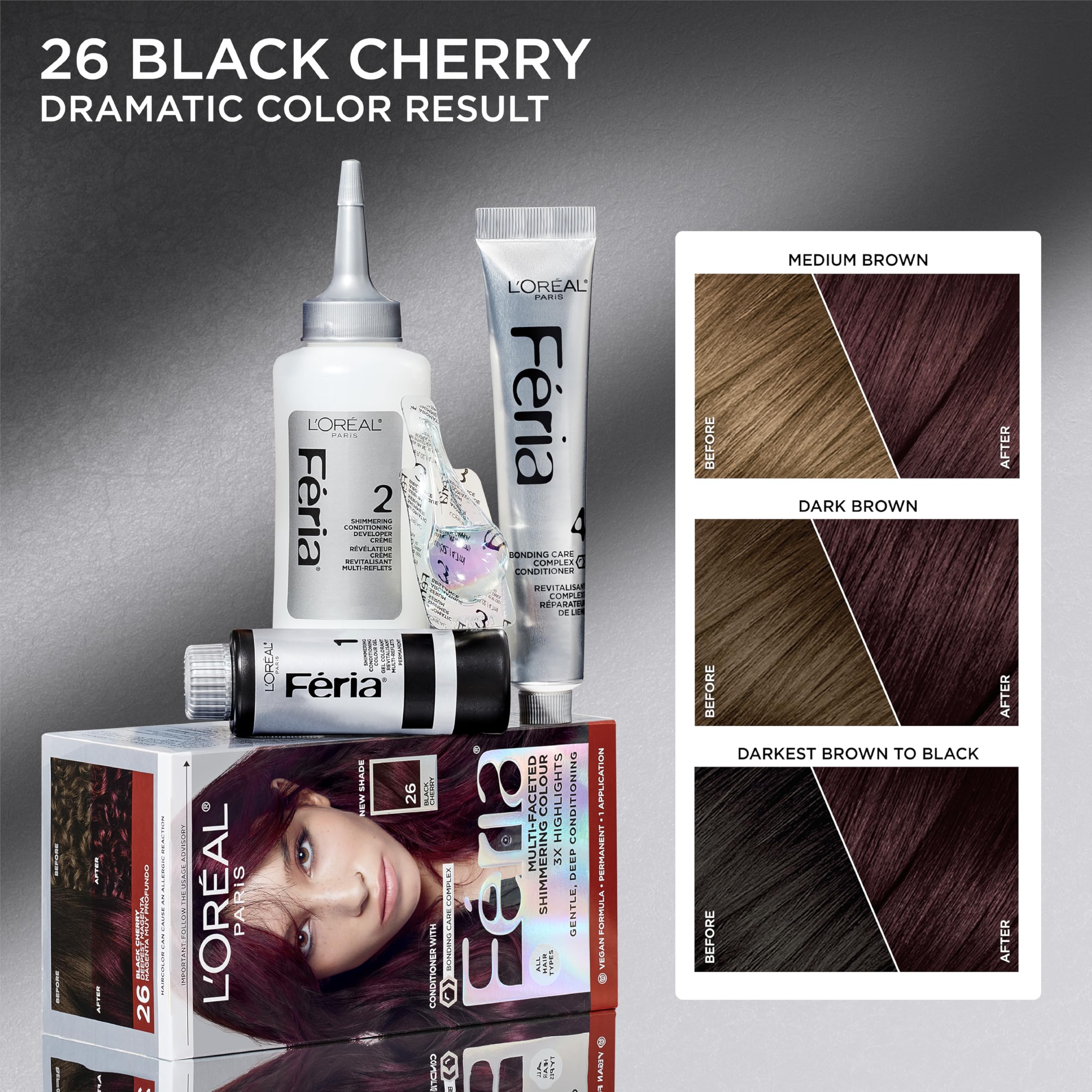 Discover Feria's NEW fashion-forward shades: Jet Black (10), Honey Brown (65), and Black Cherry (26). Serve your stunning look with custom-blended colors, crafted with 3 vibrant tones. Feria by L'Oreal Paris gives you multi-faceted, striking color vibrancy in 25 minutes. Feria delivers dramatic color transformation for dark hair. Feria provides color that doesnβt surrender β lasting week after week. Every shade includes a vitamin-infused shine serum and a Bonding Care Complex Conditioner that reinforces weak hair bonds for up to 40% stronger hair.