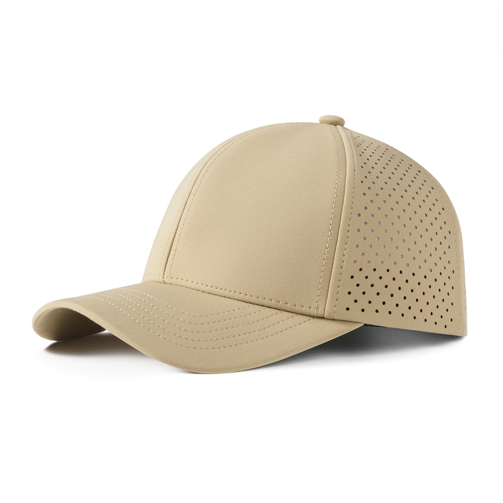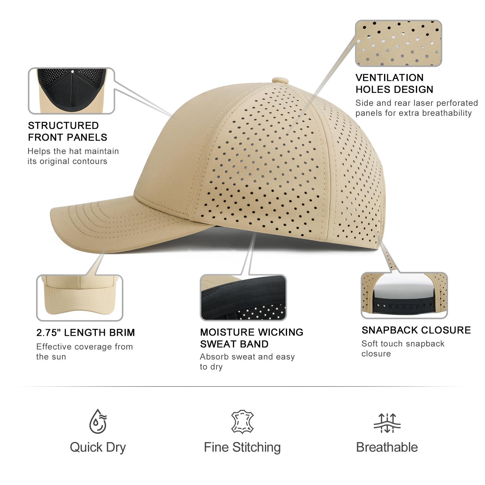 Design: structured front panels, 6-panel cap, curved brim, laser-perforated side & rear panels for breathability, and soft touch snapback closure