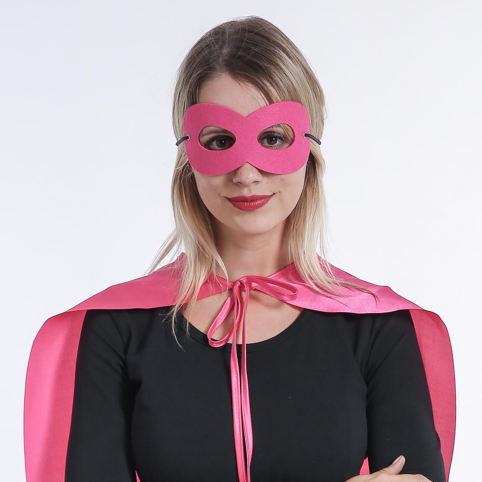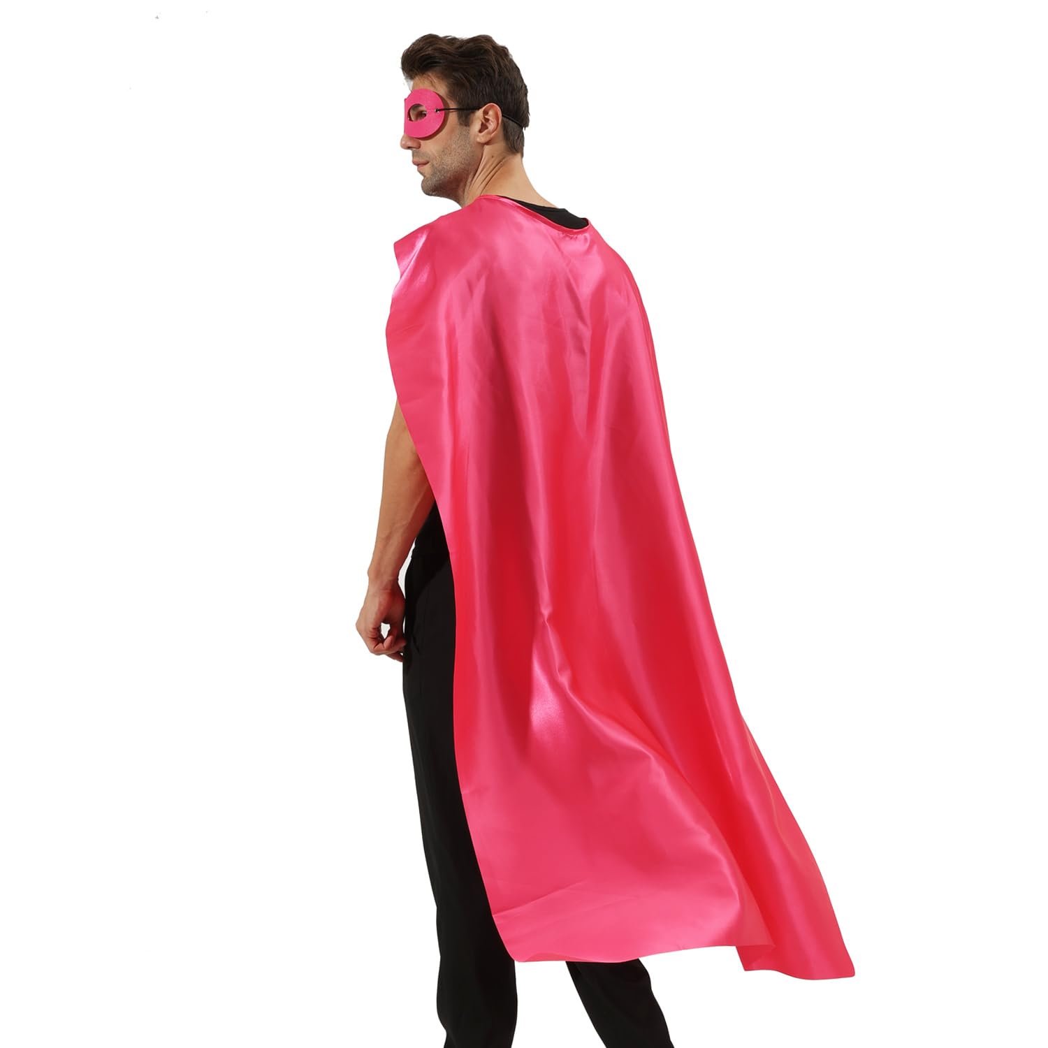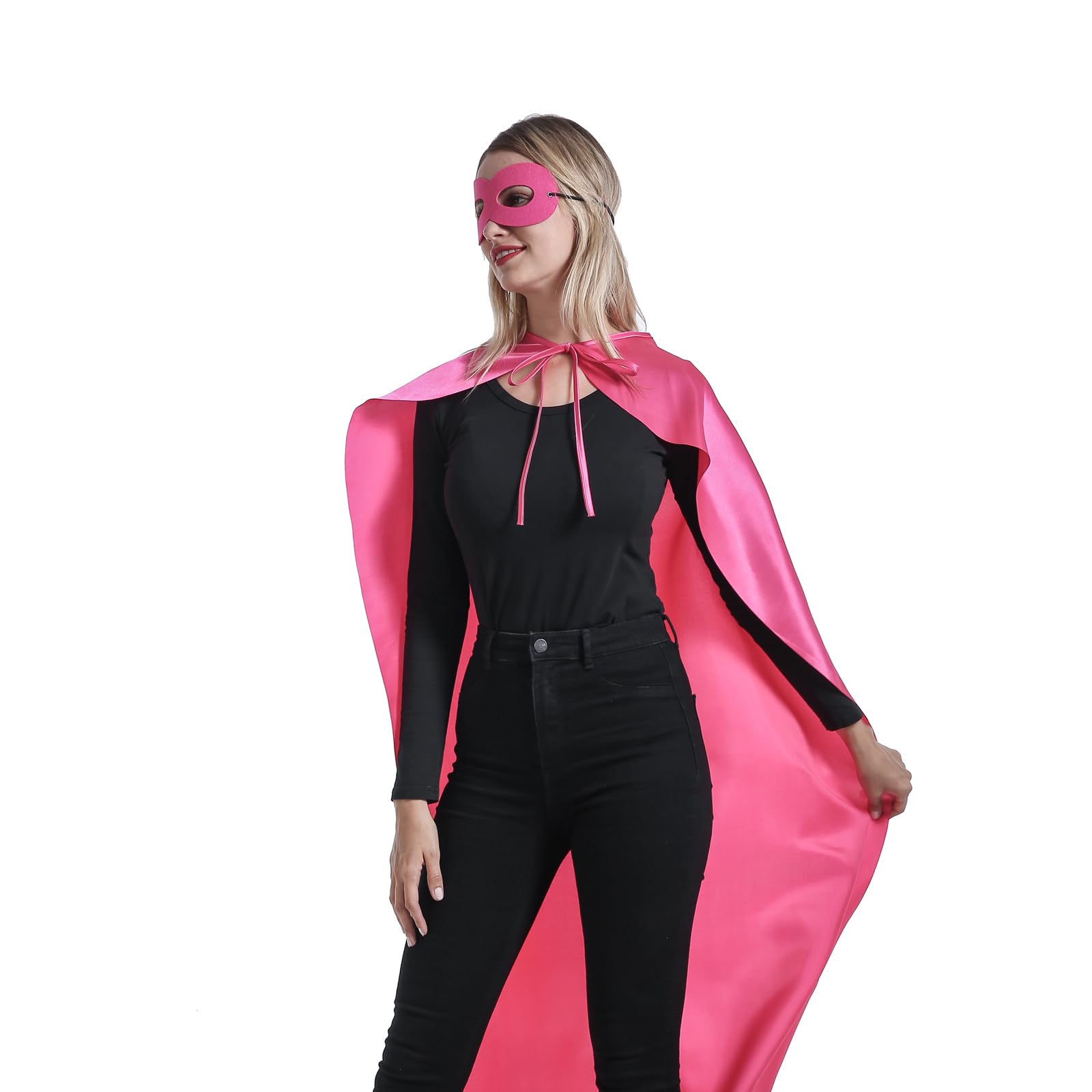 SizeοΌLength 57 x Width 38 inch for capes. Our superhero capes and masks for adult bulk pack, are designed in perfect size after plenty of test; We have round neck hole, which fits better than simply sewed straight fabric with elastic. You can tie a bow with the cord to fit easily. The masks ensure a snug with elastic but not too tight fit.