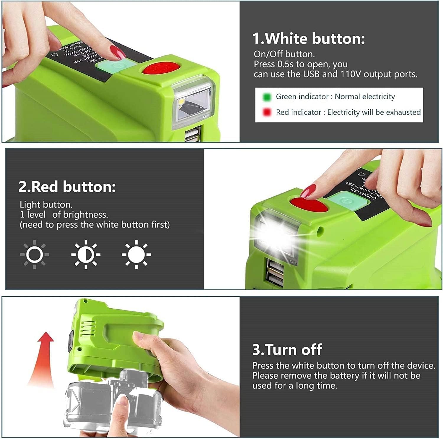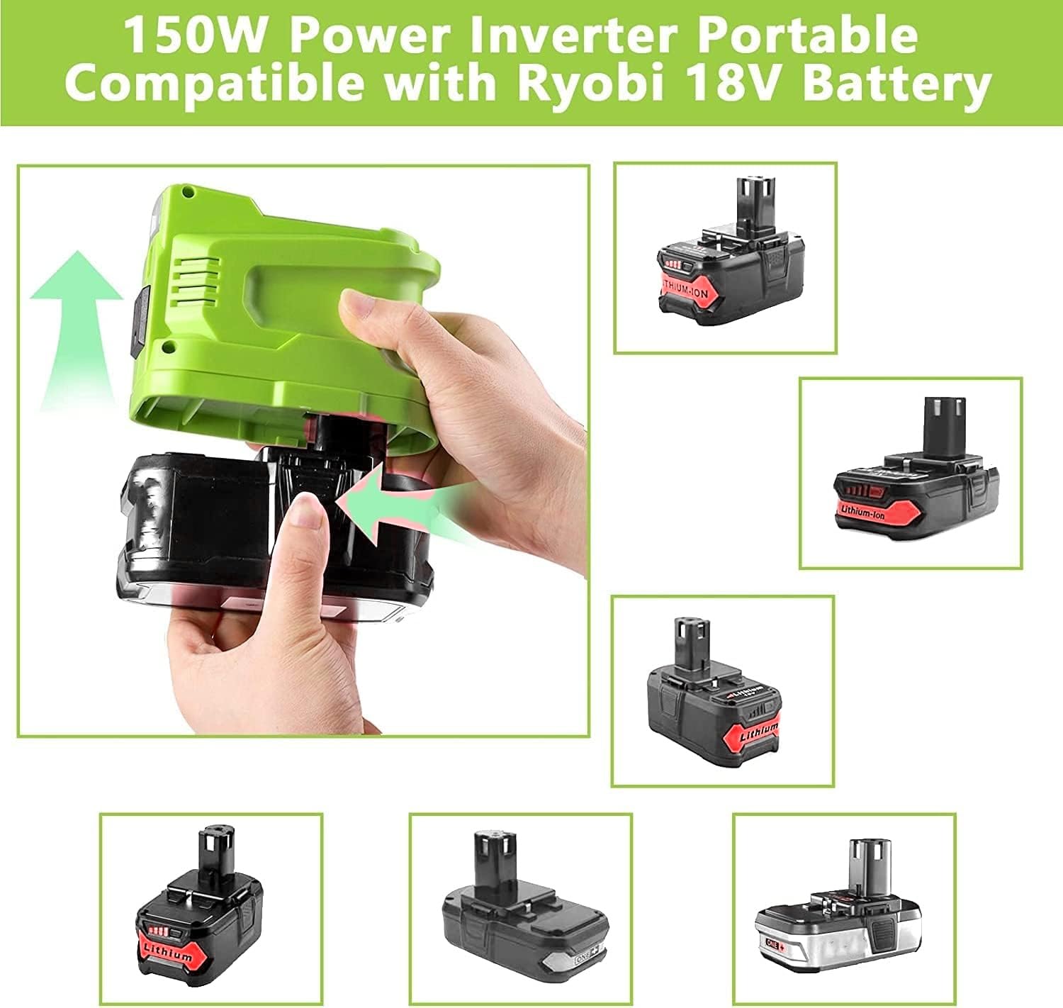 【for Ryobi 18V Battery Inverter】This power inverter is compatible with Ryobi 18V lithium battery P102 P103 P104 P105 P107 P108 P109 P190 ect and for Ryobi 18V Ni-Mh battery. It can convert the batteries to power bank to quickly charge your phone without the bulky adapter.