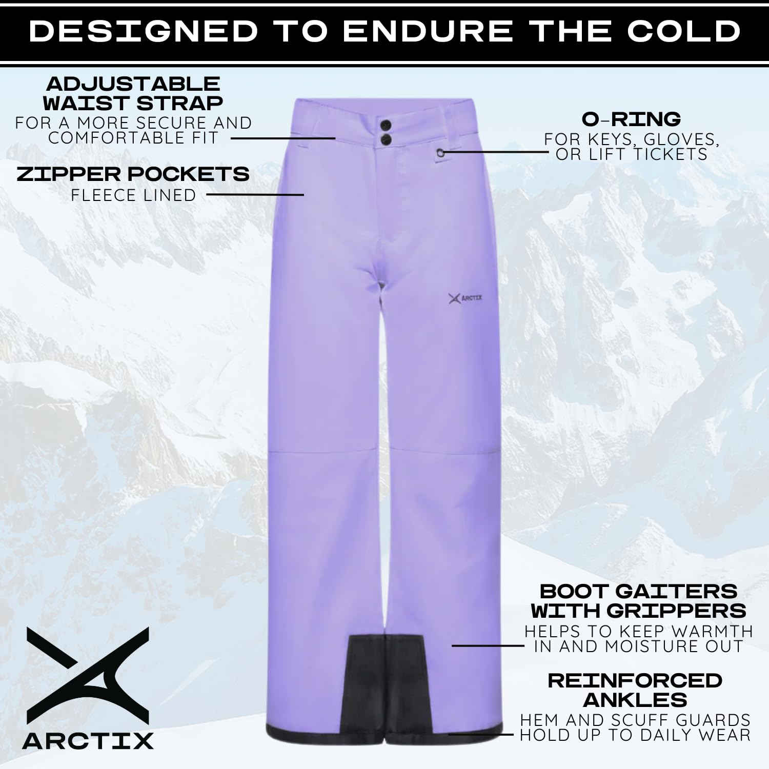 COMFORT: Zip Pockets for added security, Adjustable Waist, O-ring for keys, gloves, and lift tickets, and Boot Gaiters with Grippers form a seamless integration with boots to keep warmth in and moisture out.