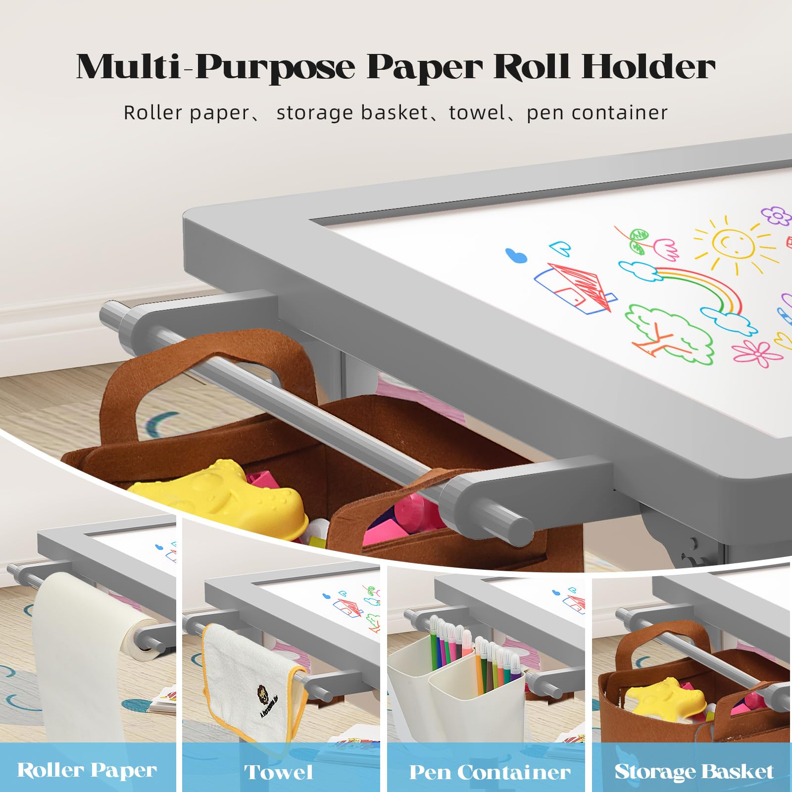 【Convenient Foldable Storage Bins & Paper Roller – Easy Organization】 The table features 3 foldable storage bins, perfect for storing sand, water, toys, or craft supplies. A built-in paper roller (paper not included) can be used for art projects or mounted with paper rolls. The roller can also be used to hang accessories like towels or storage bags, making cleanup and organization a breeze