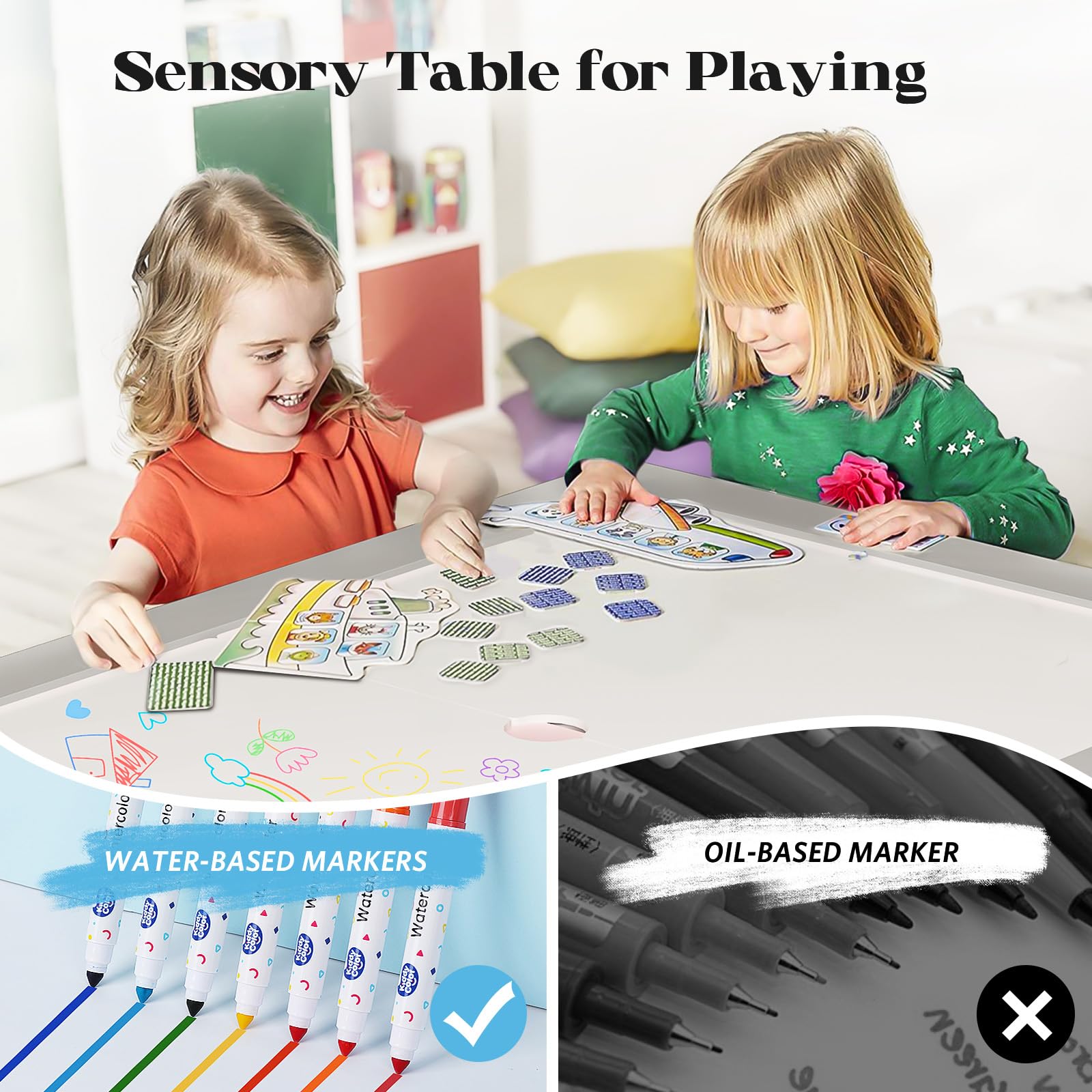 【Complete Kids Table & Chair Set - Perfect for Play, Study】 This set includes a sensory table (28.35” x 20.47” x 19.69”) . It also features four cut-out games on the packaging, offering an eco-friendly inspired and educational way for kids to play at the sensory table set. An ideal gift for preschoolers, kindergarteners, and daycare children