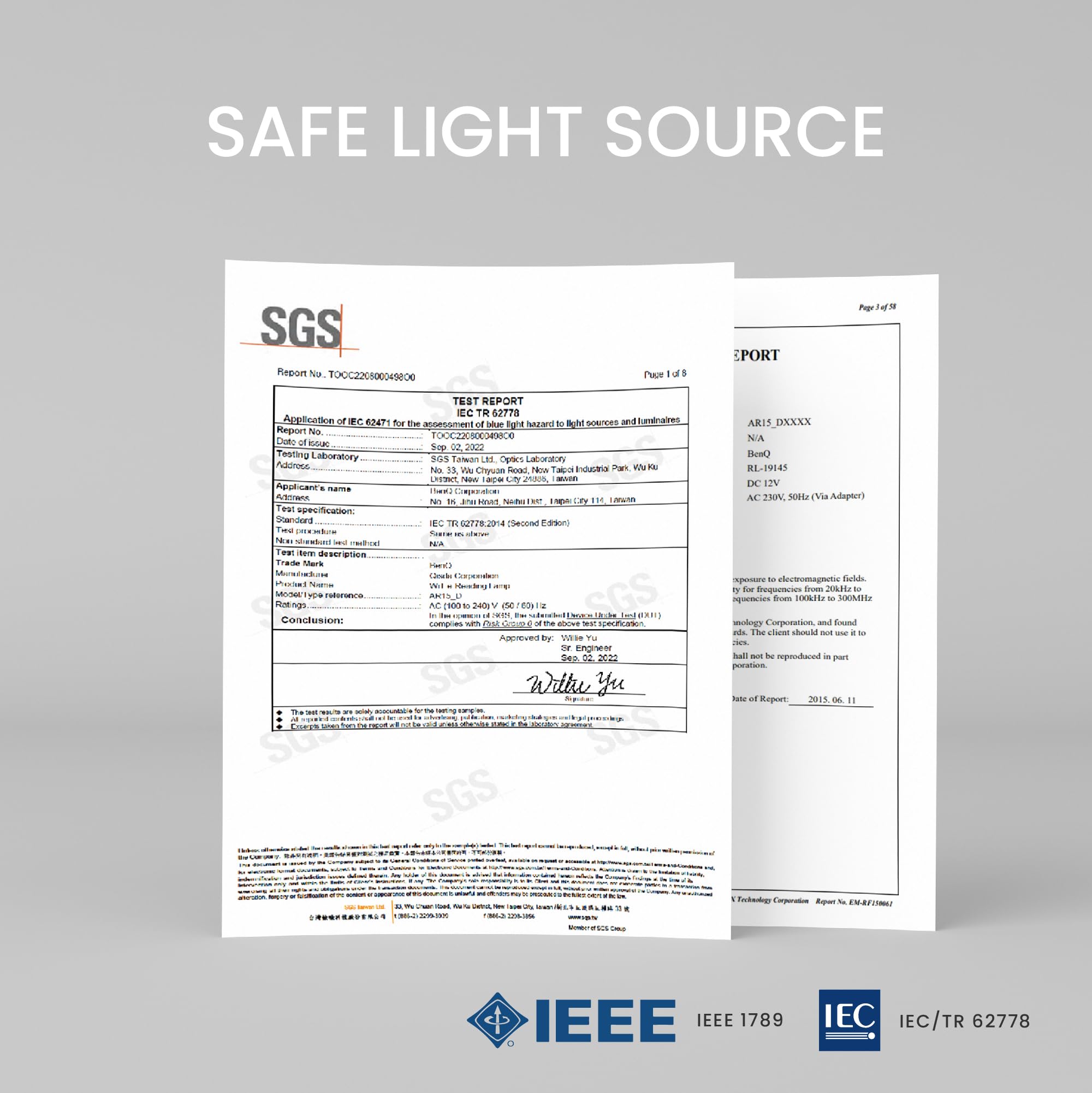 š”ćSAFE LIGHT SOURCEć: We've obtained flicker-free certification according to the IEEE 1789 standard for LED luminaires. Additionally, we are certified RG0 (risk group 0) for blue light hazard, complying with EU IEC/TR 62778 and IEC/EN 62471 standards. The BenQ e-Reading Desk Lamp has a CRI of over 95, ensuring the accurate reproduction of colors under natural light.