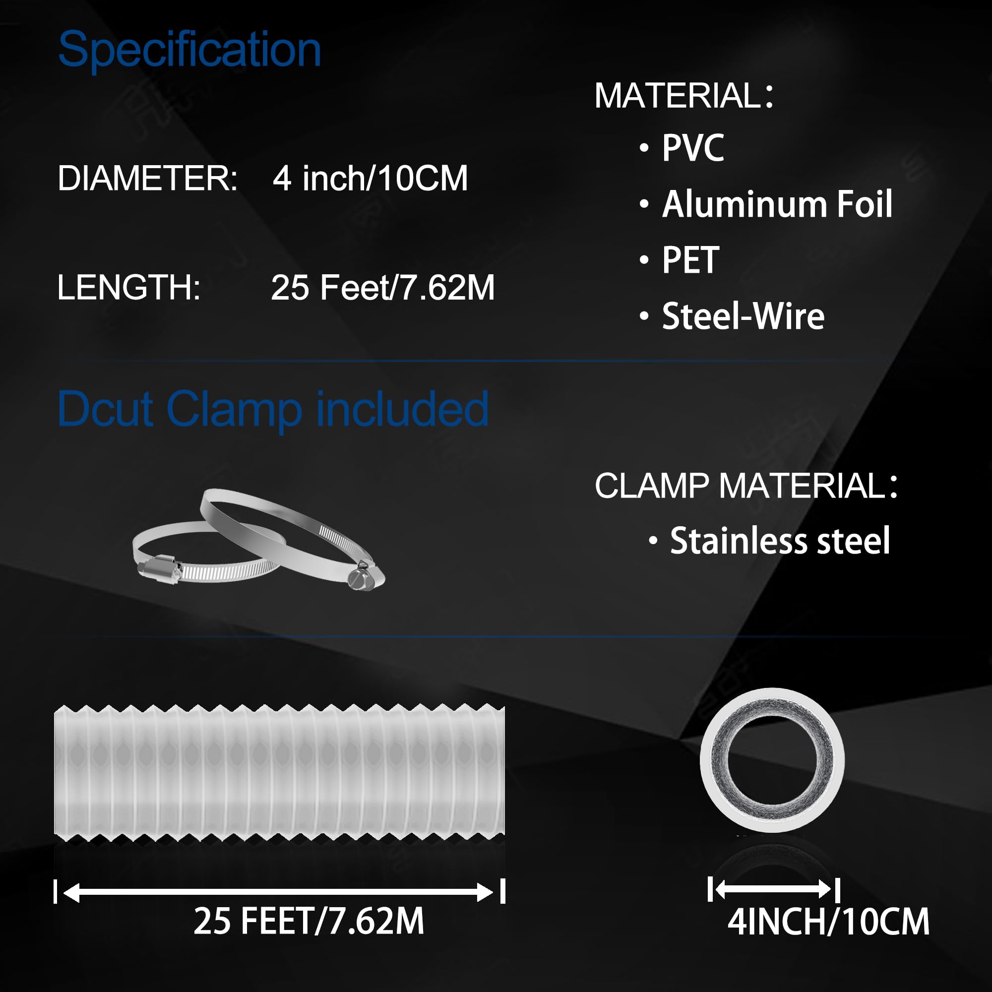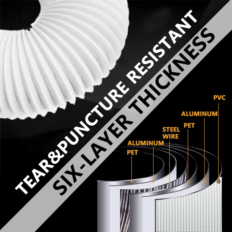 [Six-layer thickness]:The Dryer Vent Hose is made of 6 layers thickness(2 Aluminum Foil +2 PET +Steel wire+ PVC),The hose steel wire diameter is 1mm prevent deformation.The PVC film help to be light-proof,noise reduction and Insulation.