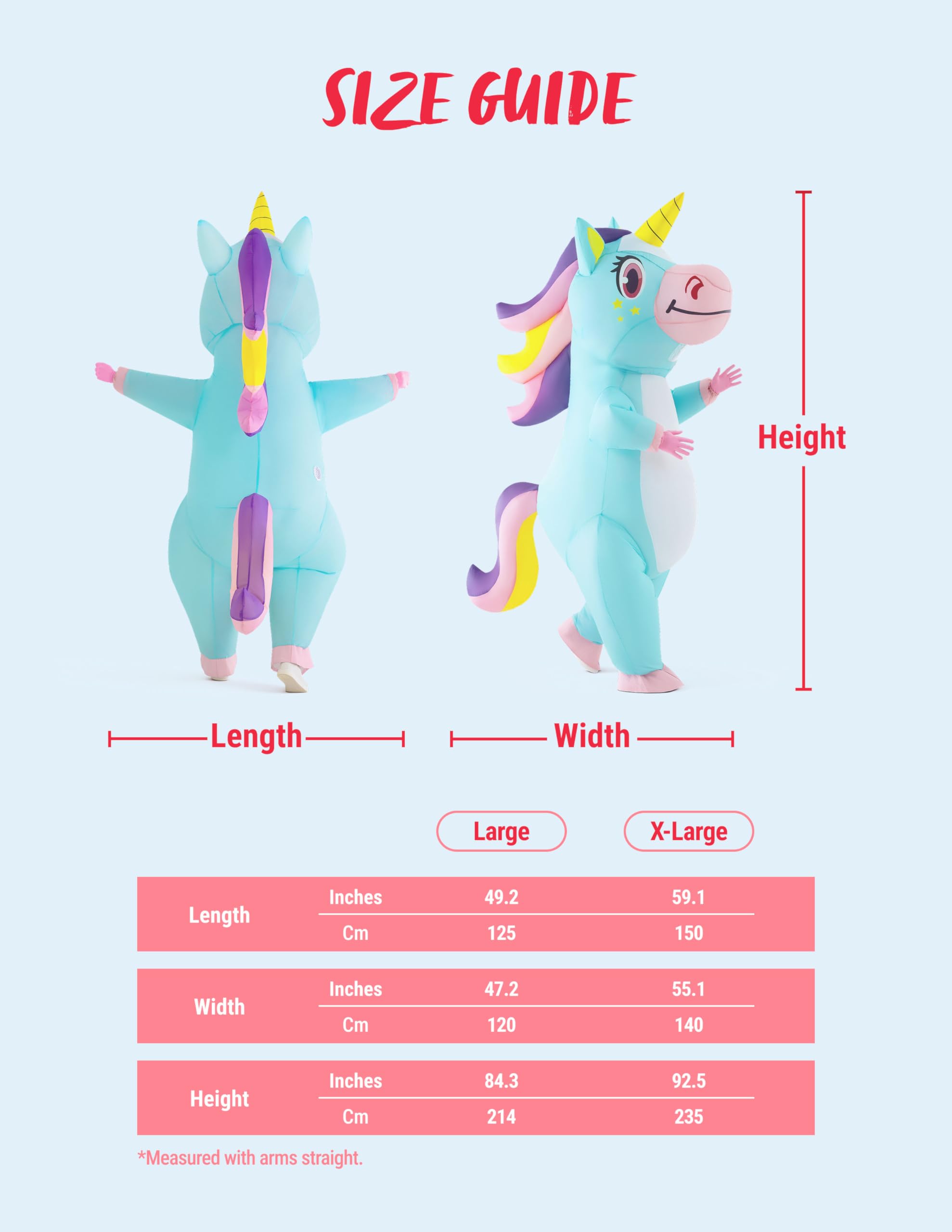 Flattering Fit Options: Available in adult size, our Unicorn Costume have TWO SIZE: Large(65in:for 59in-65in Height),X-Large(75in:for 65in-75in Height). Please refer to the size chart for accurate measurements. The inflatable design also makes for a fun and playful costume that is sure to impress.