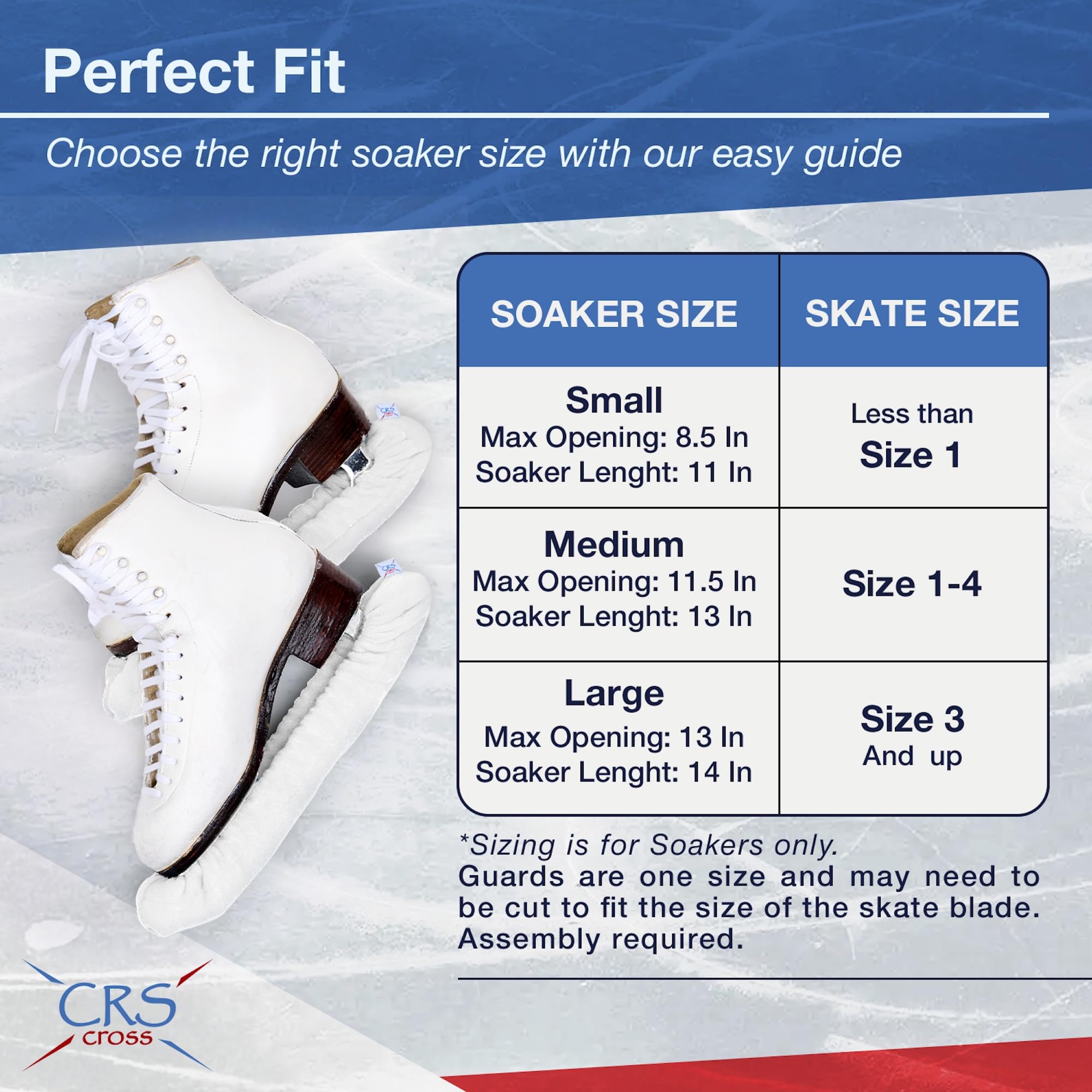 CRS Cross Soakers (also referred to as Soft Guards or Blade Covers) are made from absorbent microfiber to protect and cover ice skate blades. Your skate blades should never be stored in hard guards. Blades should be dried thoroughly the towel and stored in CRS Cross soakers. Three sizes are available based Small, Medium or Large (see size chart according to boot size). Small fits Junior/Youth boot size 1 or smaller, Medium fits adult sizes 1-4, Large fits adult sizes 4+.