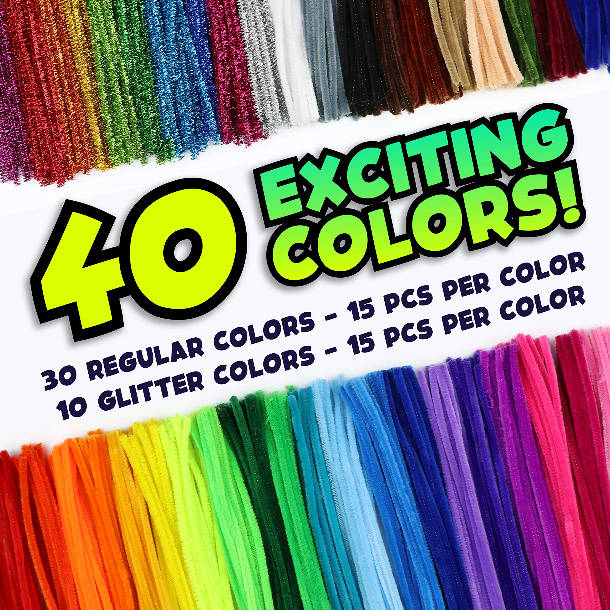 LARGE PACK: 600 quality pipe cleaners in 40 exciting colors with 15 pieces of each color! 30 standard colors and 10 metallic pipe cleaner colors. Made of safe, non-toxic wire and fiber—12 inches x 6mm.