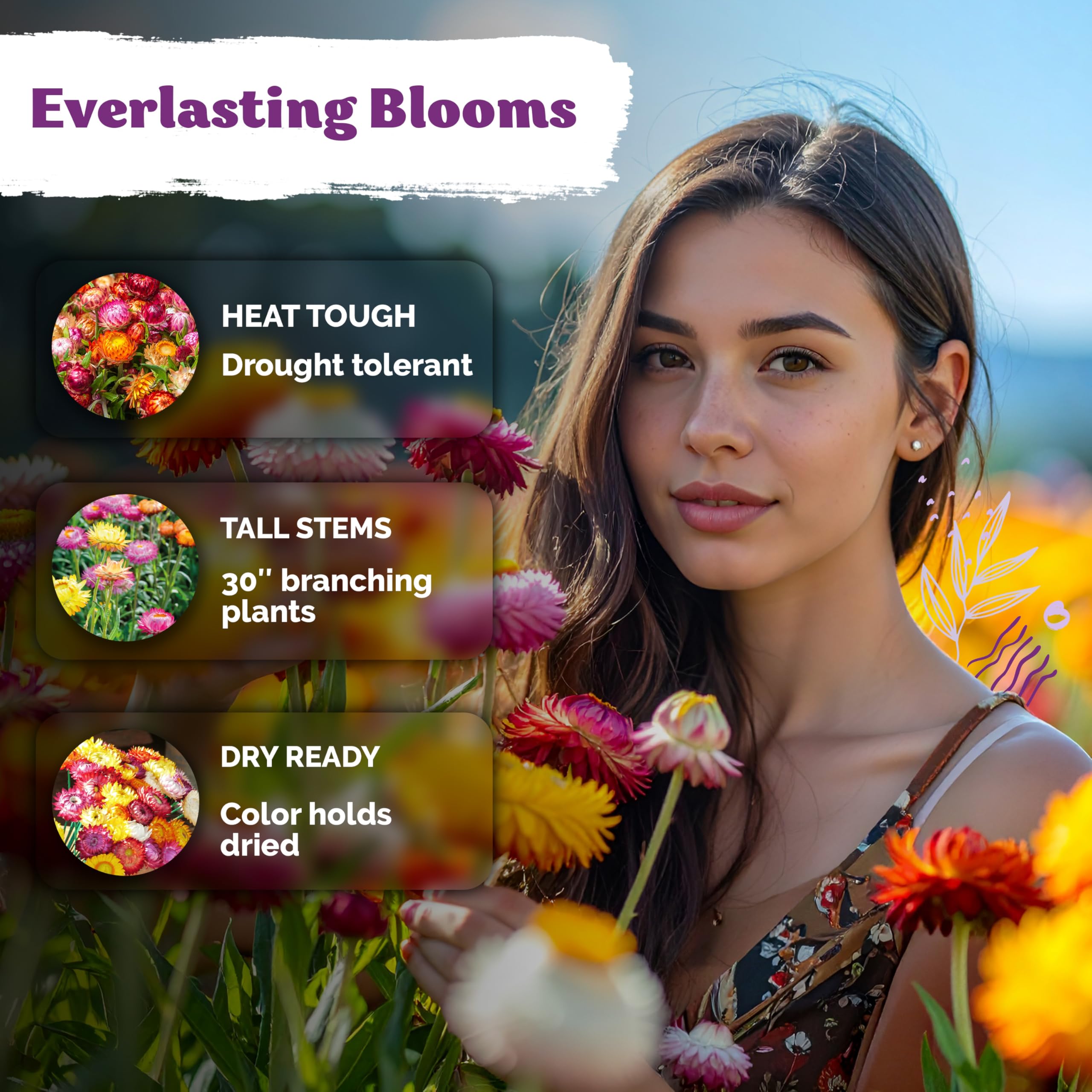 Drought and Heat Tolerant: 30" tall everlasting flower endures poor soil & blazing sun, brightening pollinator garden borders or pots with straw flowers perfect for fresh & dried bouquets.